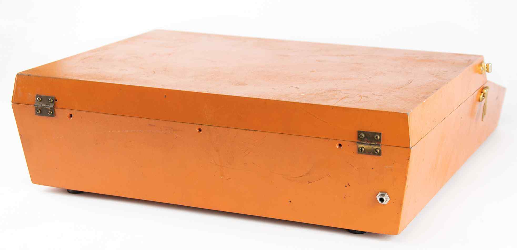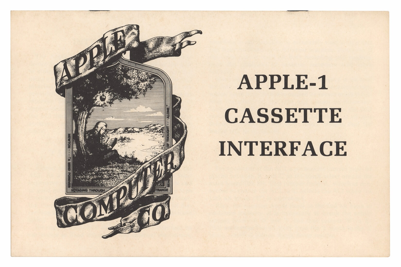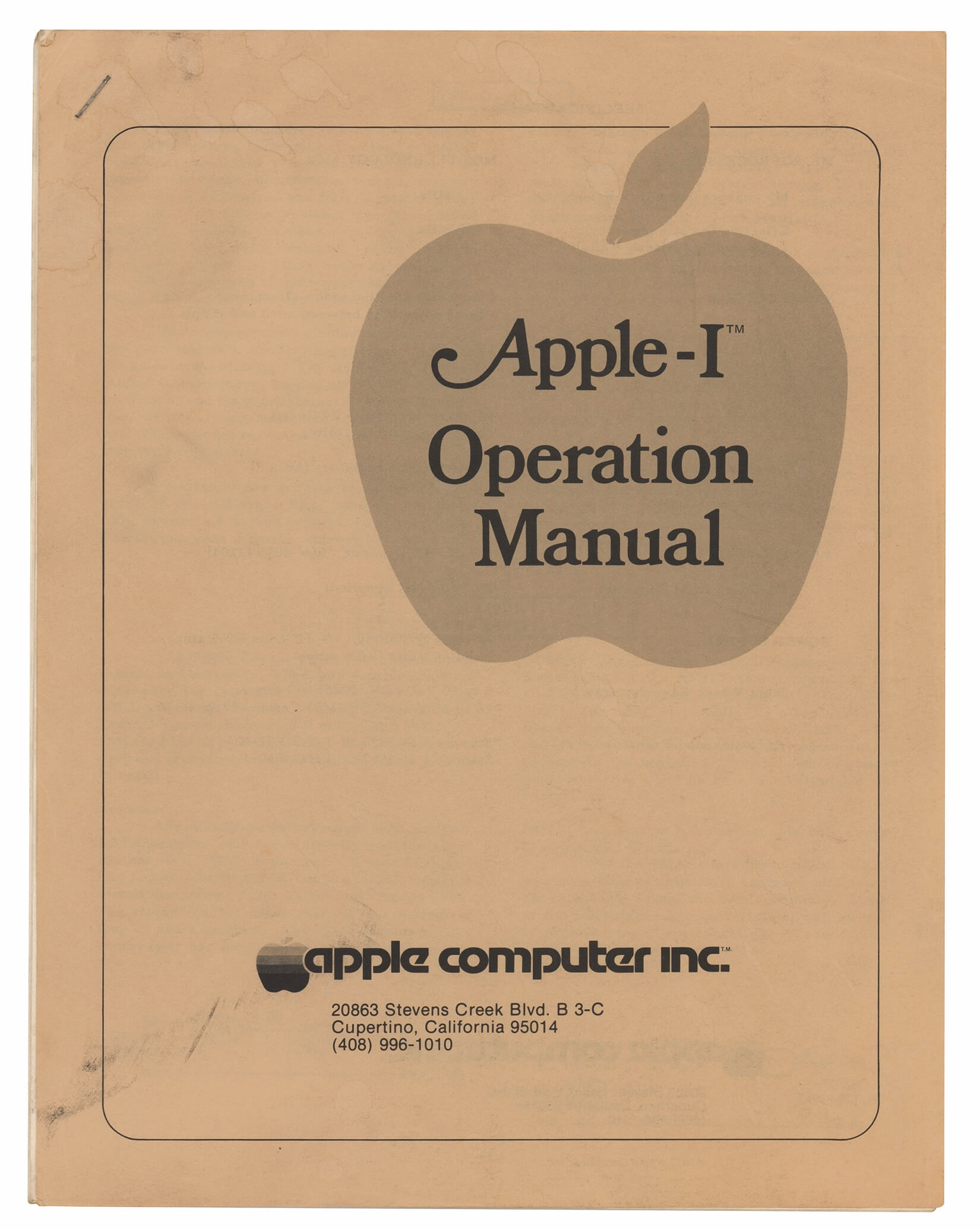 Original tan Apple-1 Operation Manual, original tan Preliminary Apple Basic User's Manual, original Apple-1 Cassette Interface Manual. Custom-made wooden case with Clare-Pendar ASCII keyboard from the Data Domain store. Panasonic TR-930U CRT monitor from 1986. Period-correct Panasonic RQ3109DS cassette recorder.