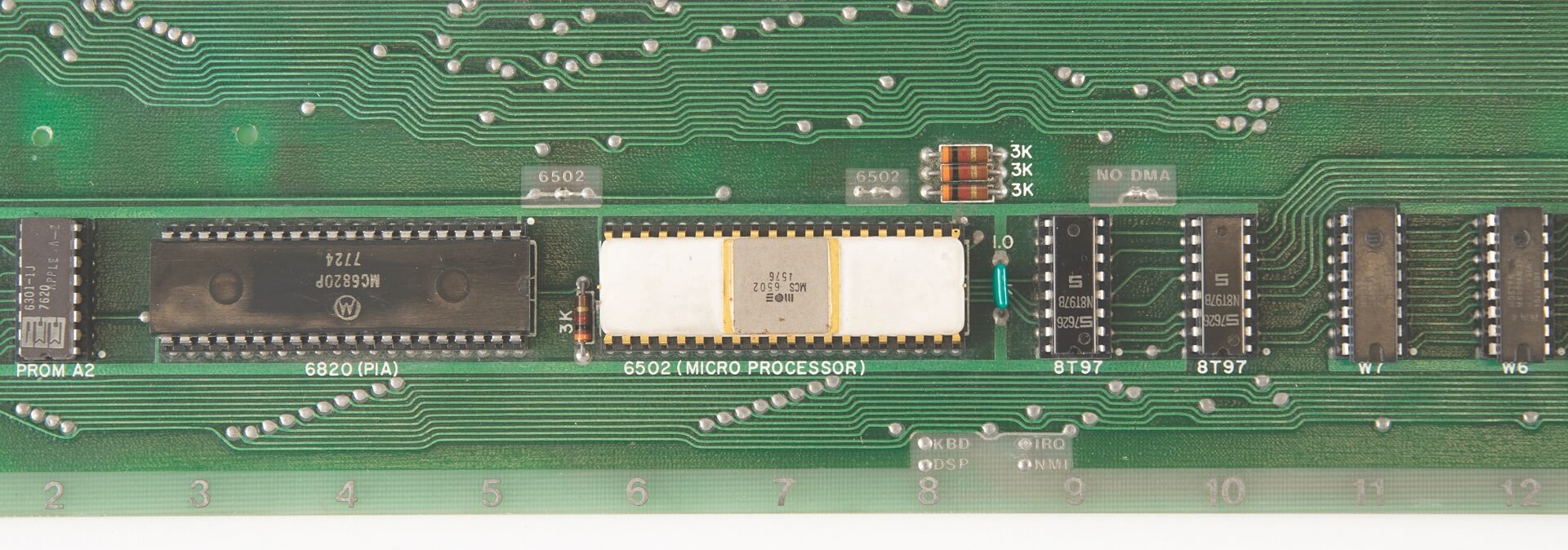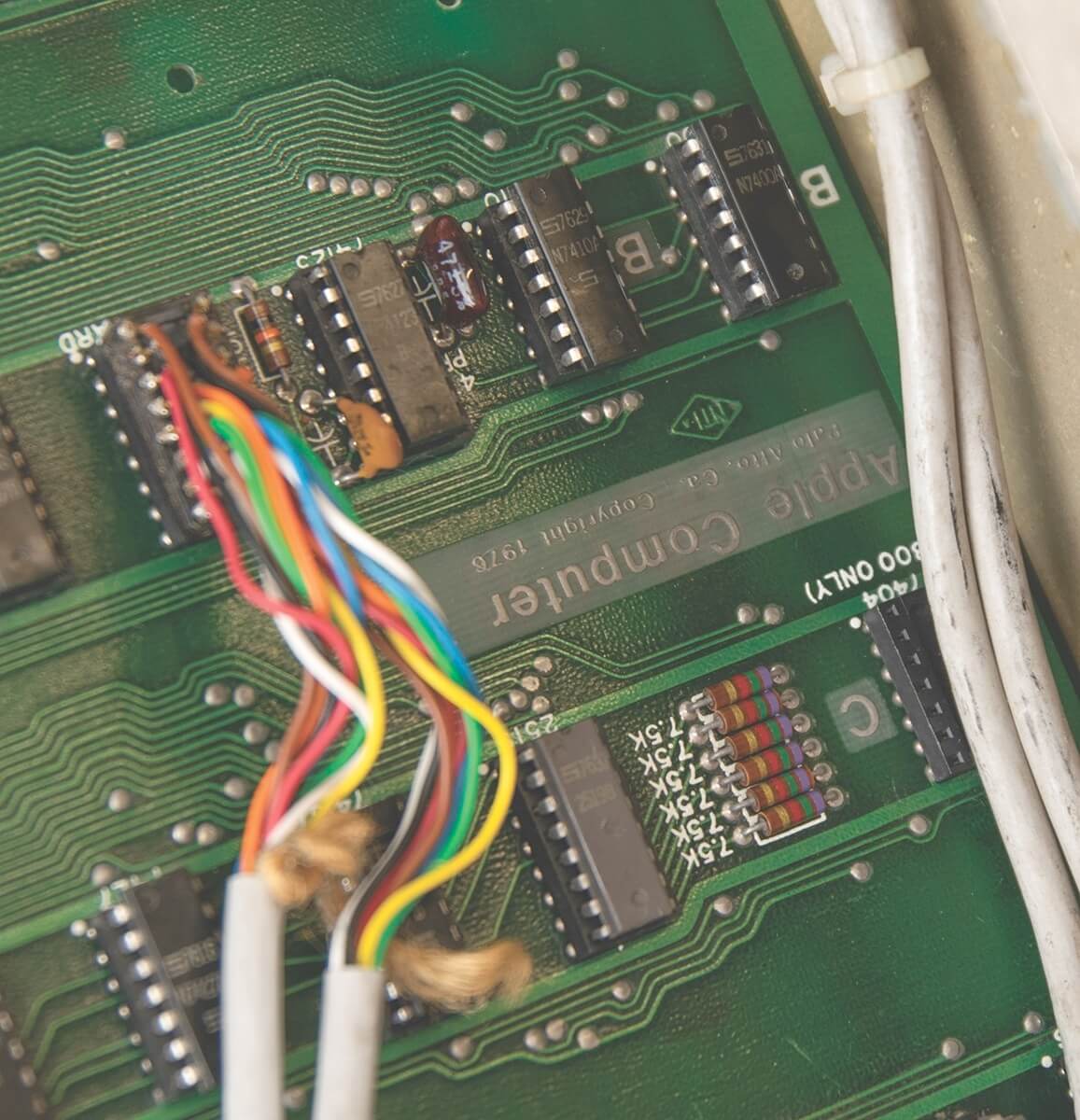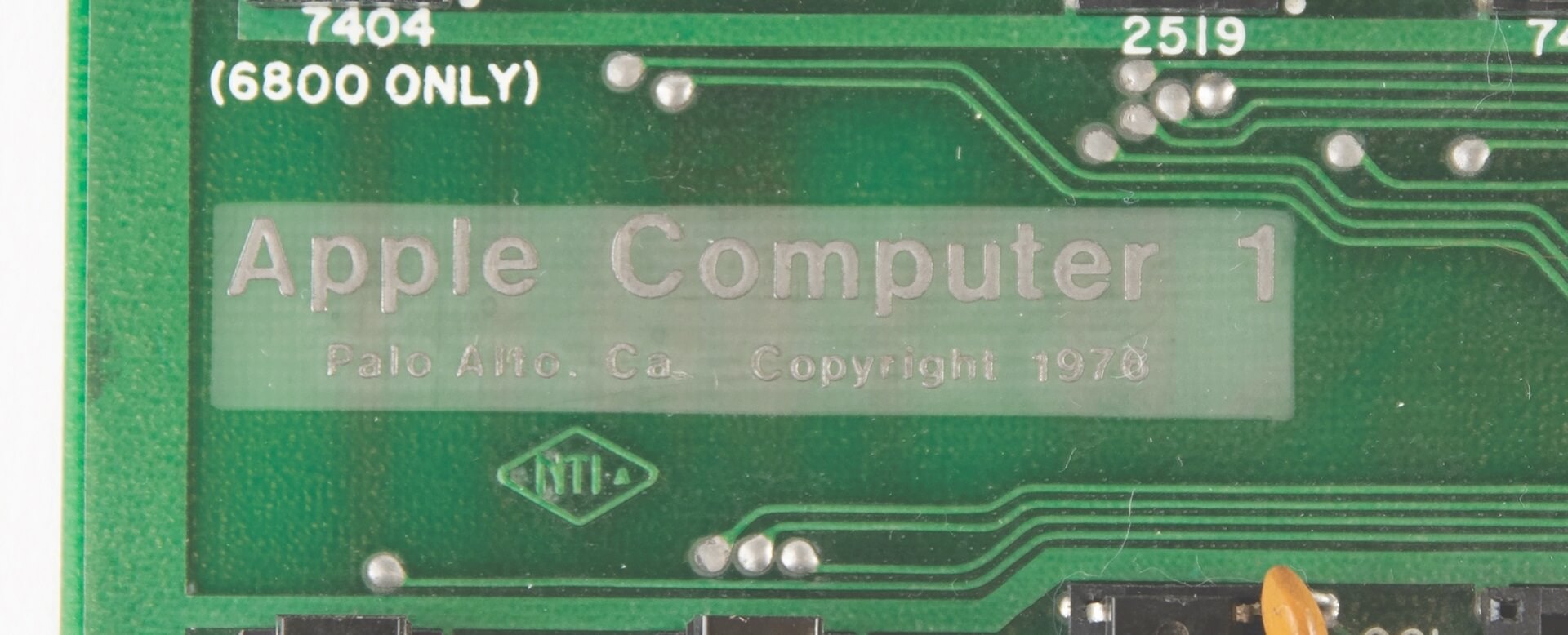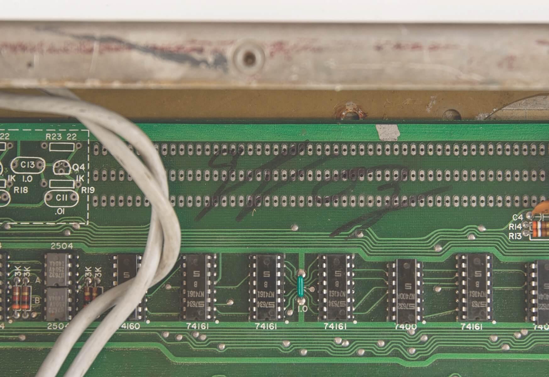Signed by Woz. PIA, LM320MP5, and LM320MP12 are not original. Slight damage from a soldering iron on two memory sockets. One +12V trace has been repaired. A small green coating above the breadboard is missing (very typical for NTI boards and most likely due to a removed label). A 100k resistor has been added on the backside for the 74123. Two small holes were drilled in the board above the PROMs. Resistor changed on the ACI above the A4 PROM.