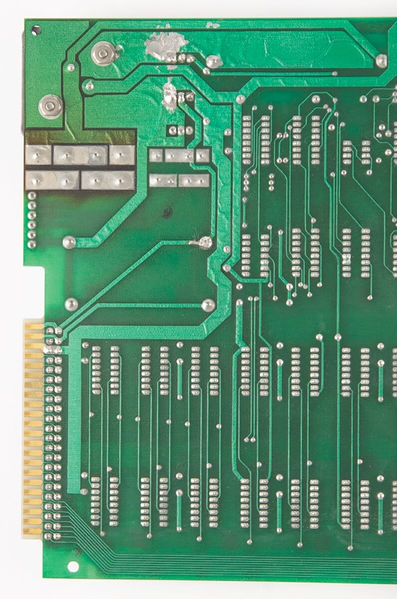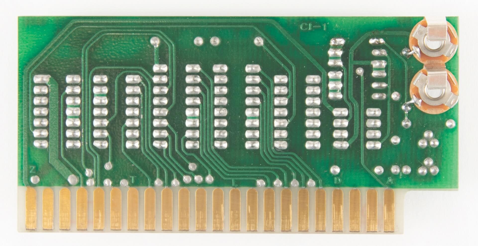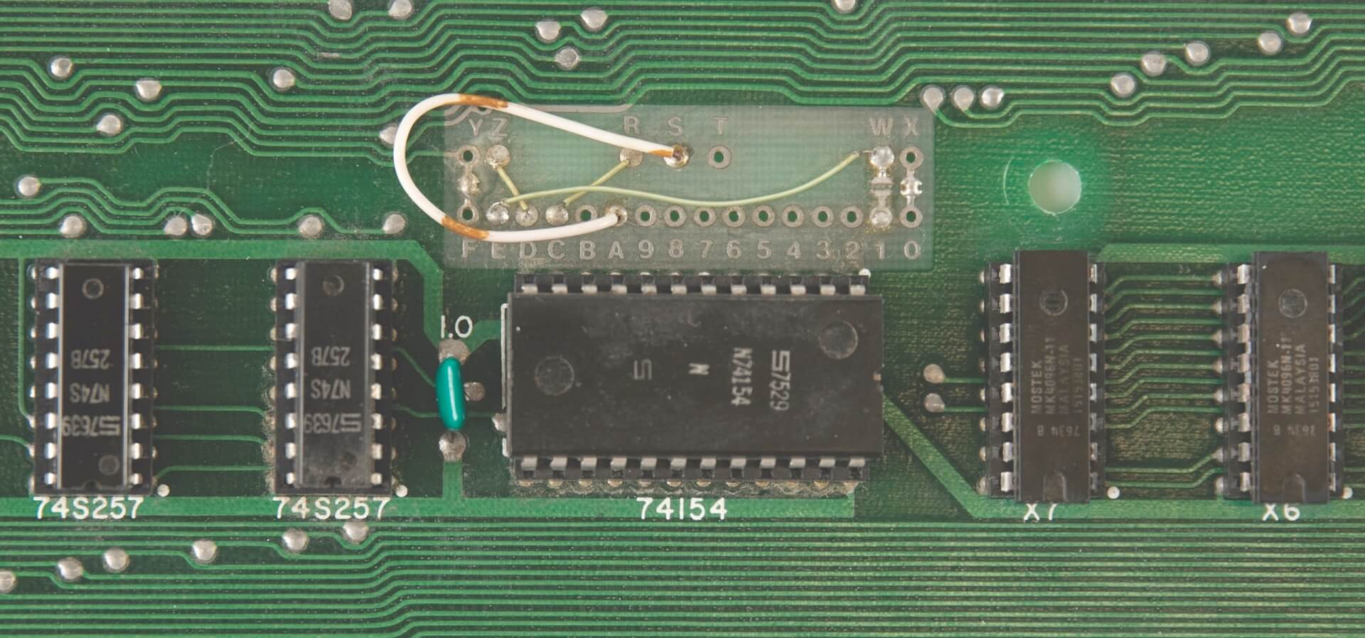 Signed by Woz. PIA, LM320MP5, and LM320MP12 are not original. Slight damage from a soldering iron on two memory sockets. One +12V trace has been repaired. A small green coating above the breadboard is missing (very typical for NTI boards and most likely due to a removed label). A 100k resistor has been added on the backside for the 74123. Two small holes were drilled in the board above the PROMs. Resistor changed on the ACI above the A4 PROM.