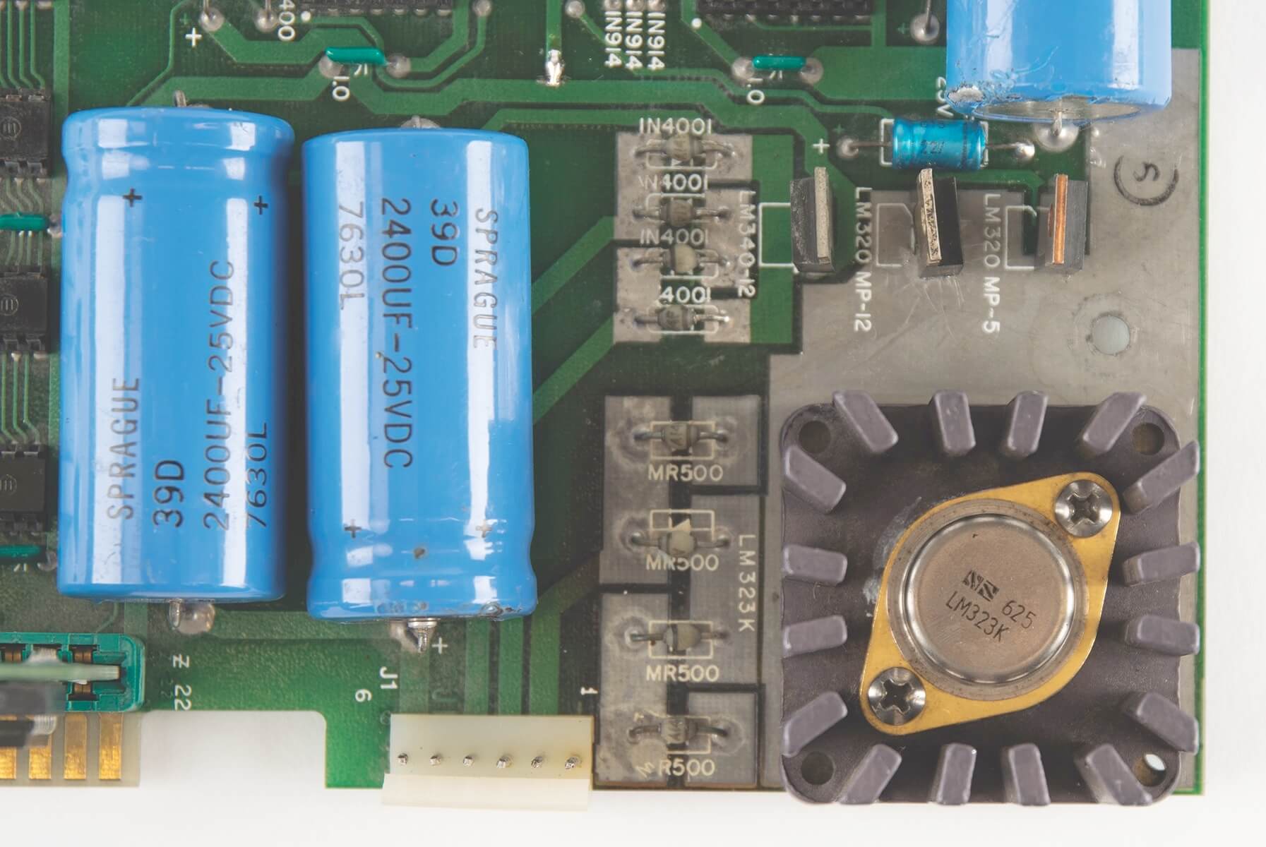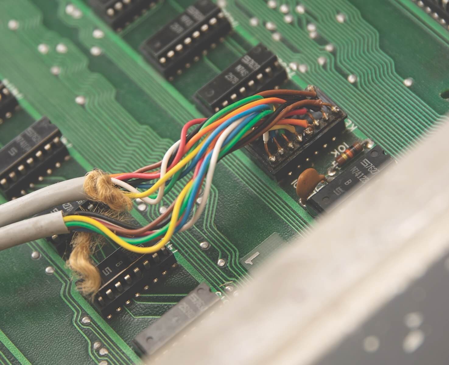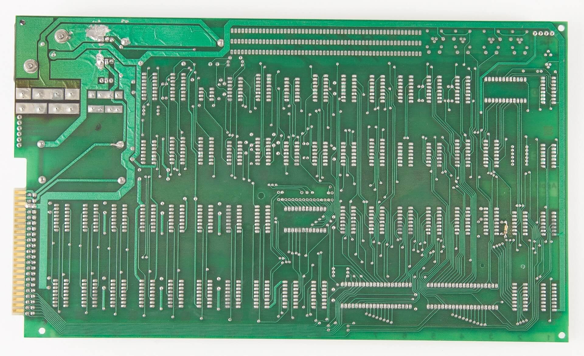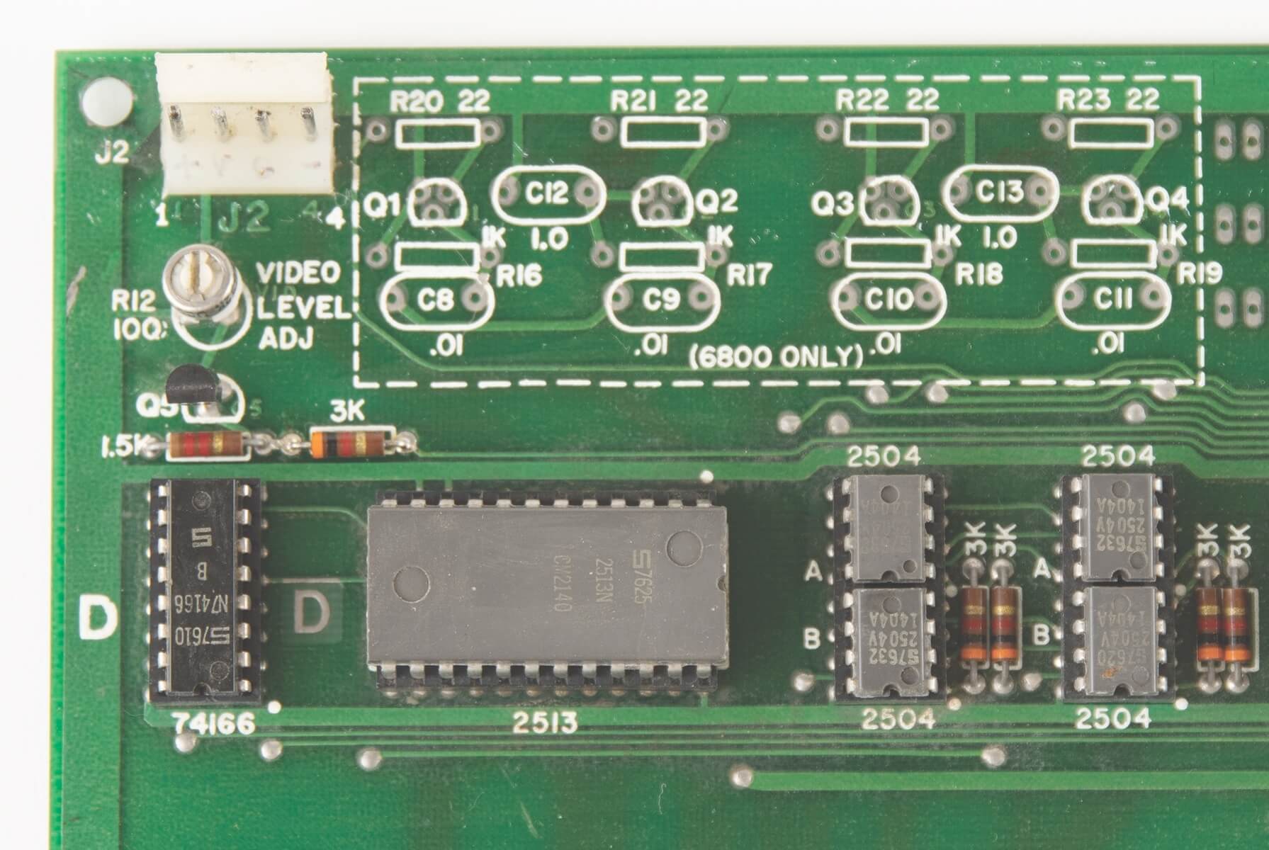 Signed by Woz. PIA, LM320MP5, and LM320MP12 are not original. Slight damage from a soldering iron on two memory sockets. One +12V trace has been repaired. A small green coating above the breadboard is missing (very typical for NTI boards and most likely due to a removed label). A 100k resistor has been added on the backside for the 74123. Two small holes were drilled in the board above the PROMs. Resistor changed on the ACI above the A4 PROM.