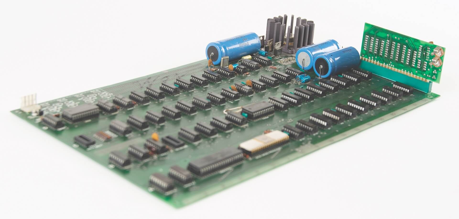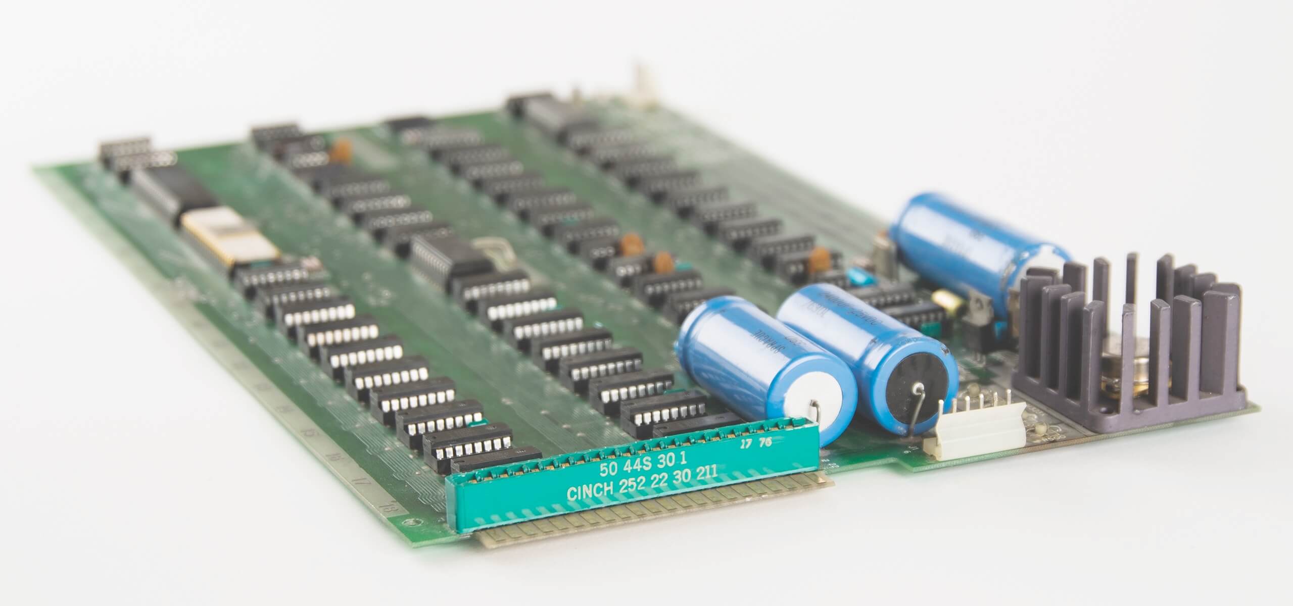CPU MOS 6502 (4576), PIA Motorola MC6820 (7724), 8K Mostek MK4096N-11 (7634). 7 blue and one yellow capacitor.