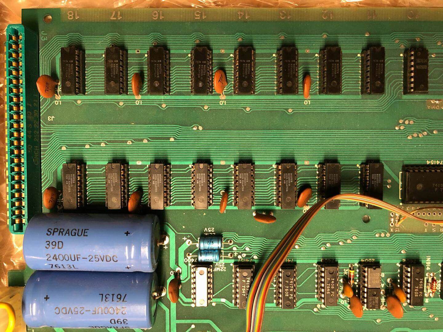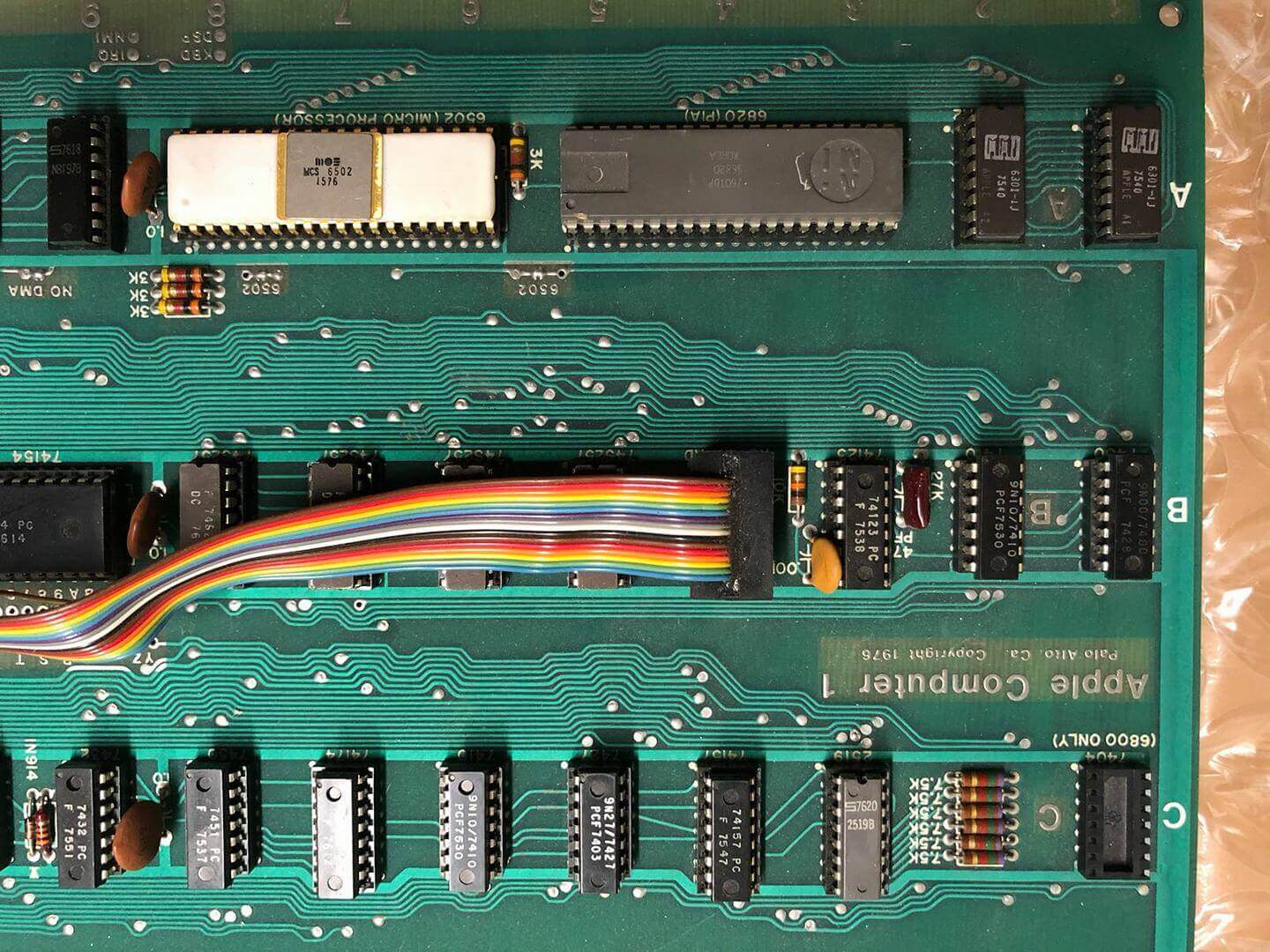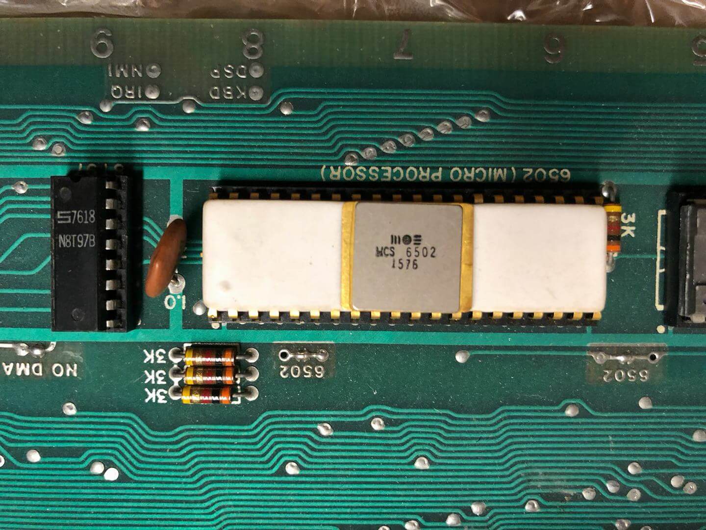 White ceramic MOS MCS 6502 CPU (1576), plastic AMI S6820 PIA (7601), 8 KB plastic DRAM.