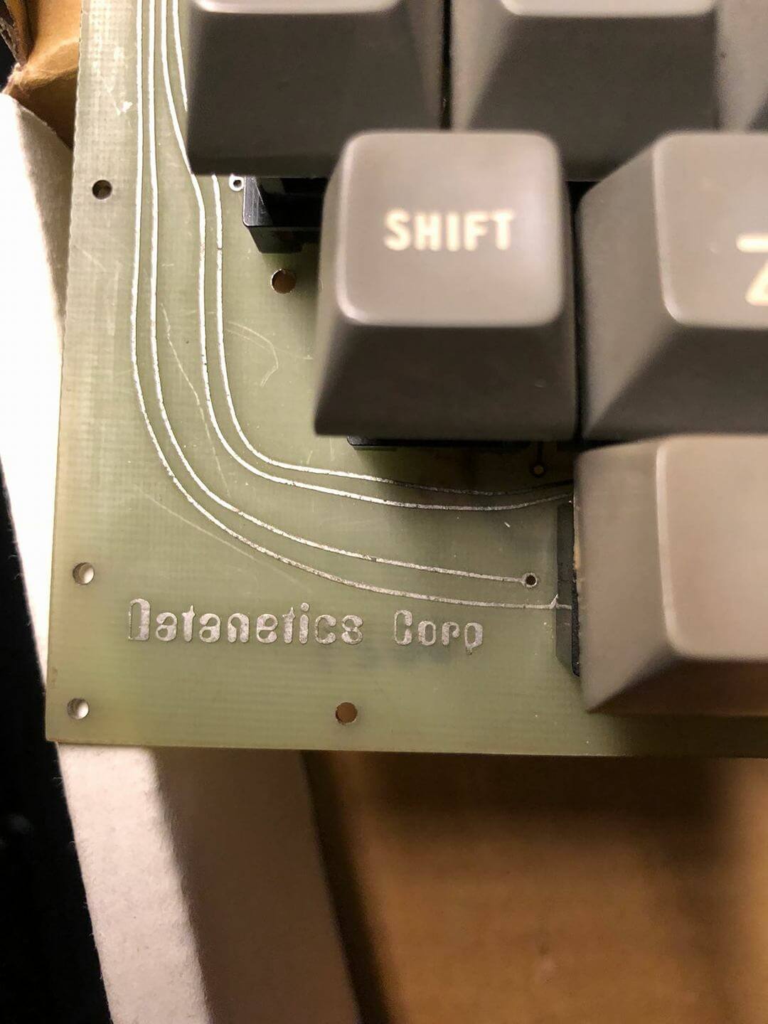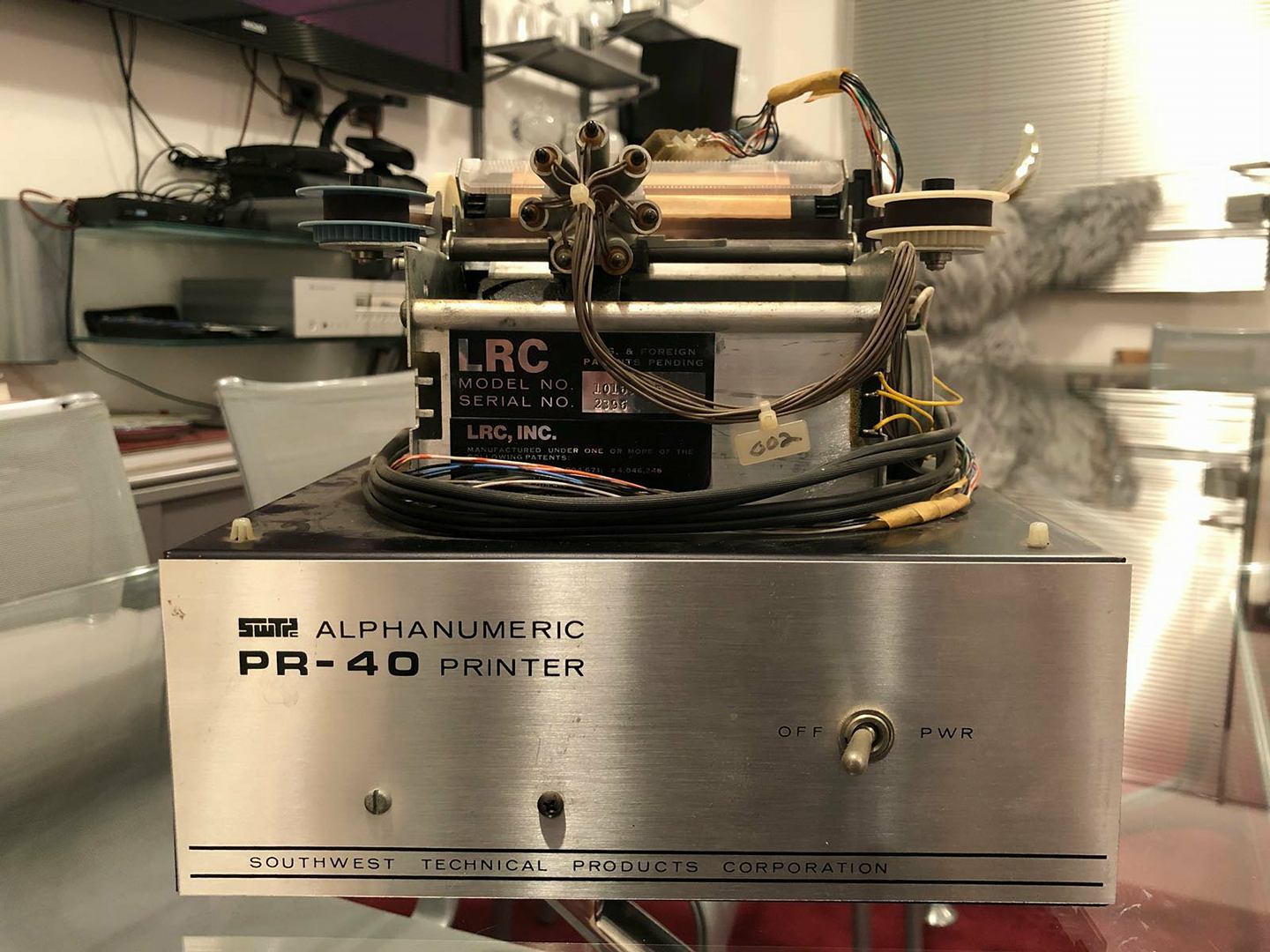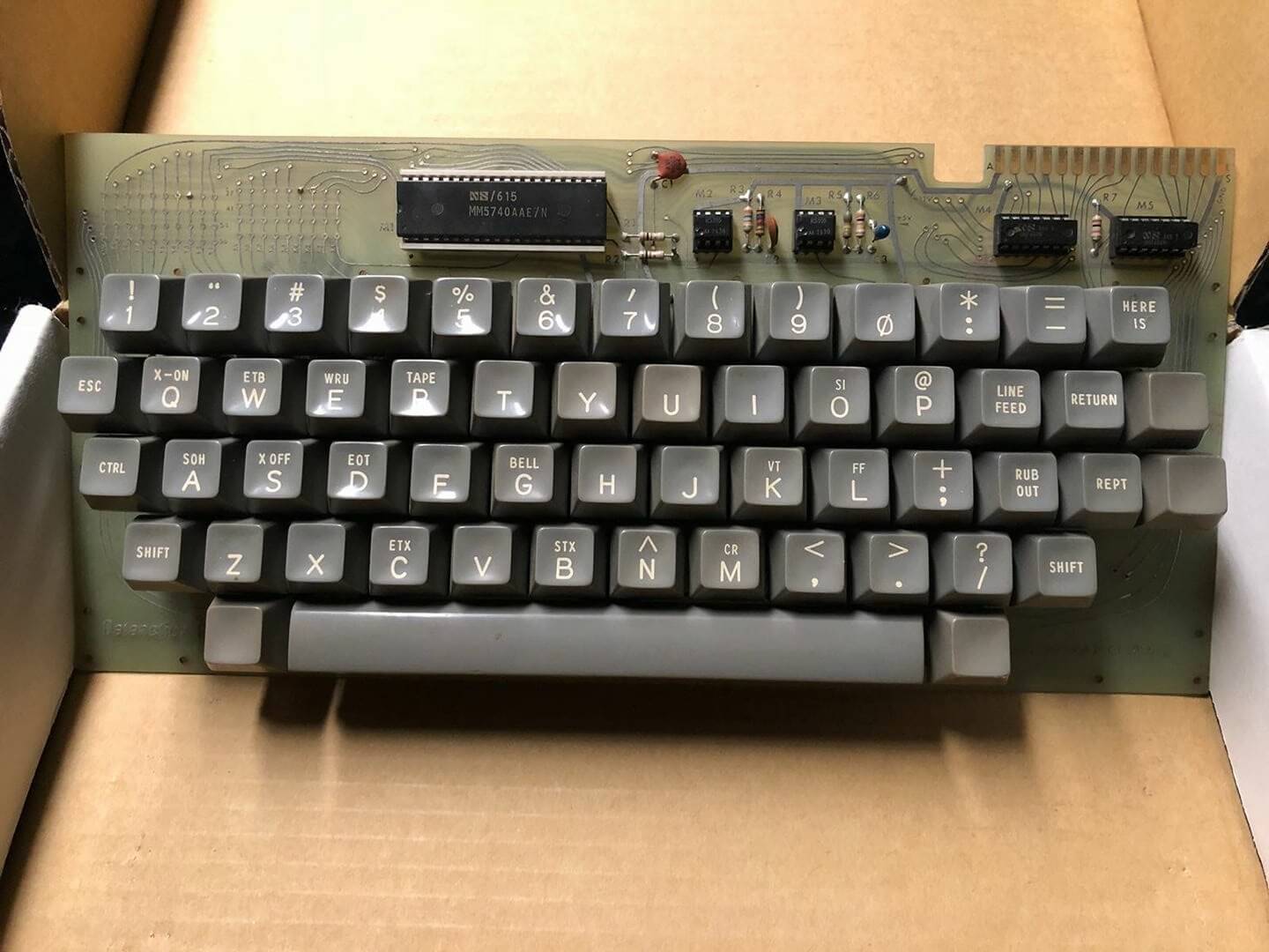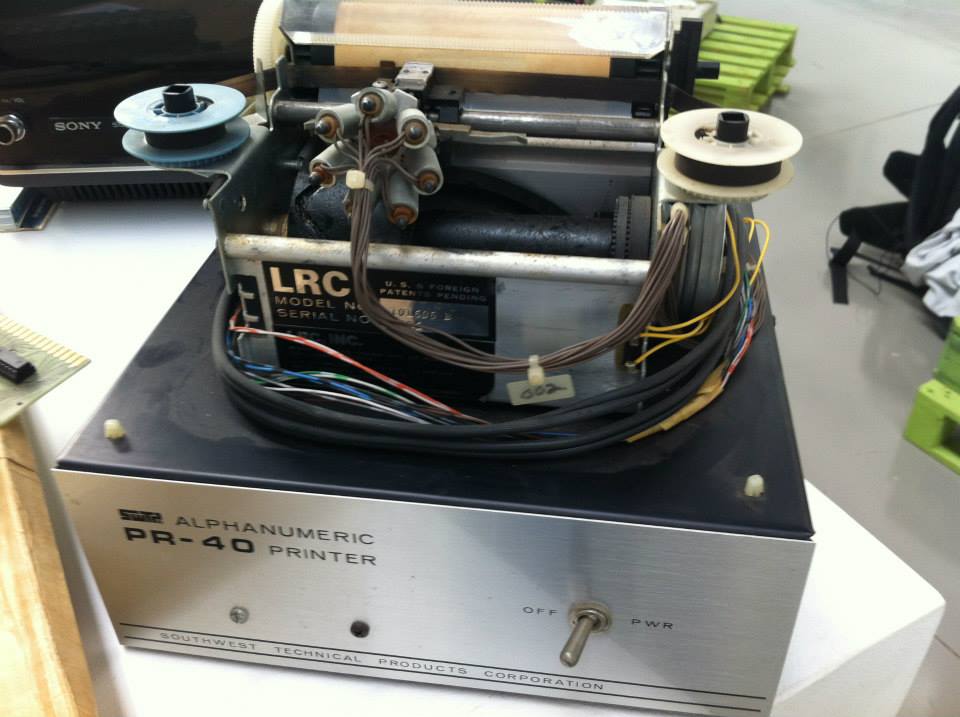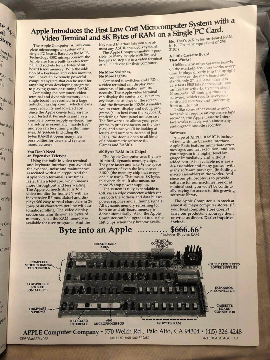 Datanetics keyboard DC900-0099-0 ASR 33 (CRT BD 02-1661-01 REV B) from May 28, 1976 with stamps 0023, DC Test, DC Test 2. Keyboard adapter. Sony 115 TV monitor. SWTPc PR-40 printer with silver front plate and black reel instead of white (could be a prototype). *Interface Age* magazine, September 1977, with full-page Apple ad.