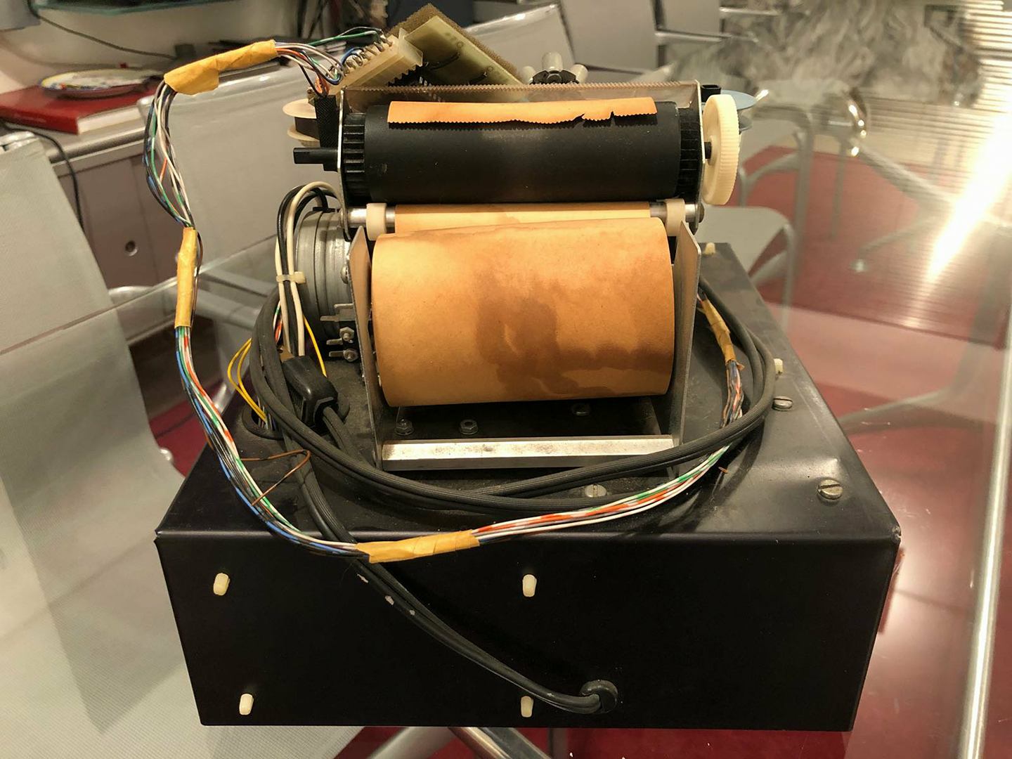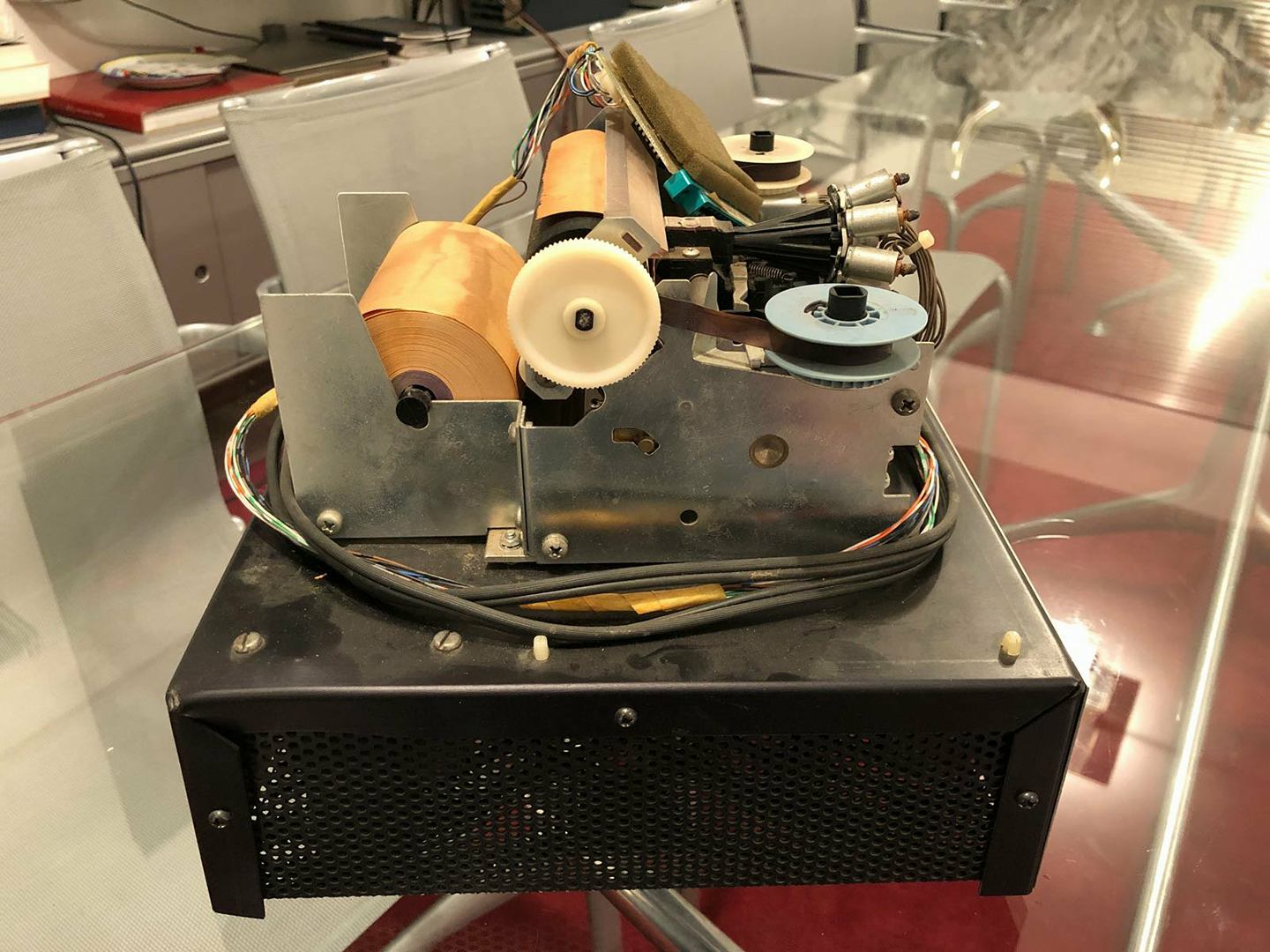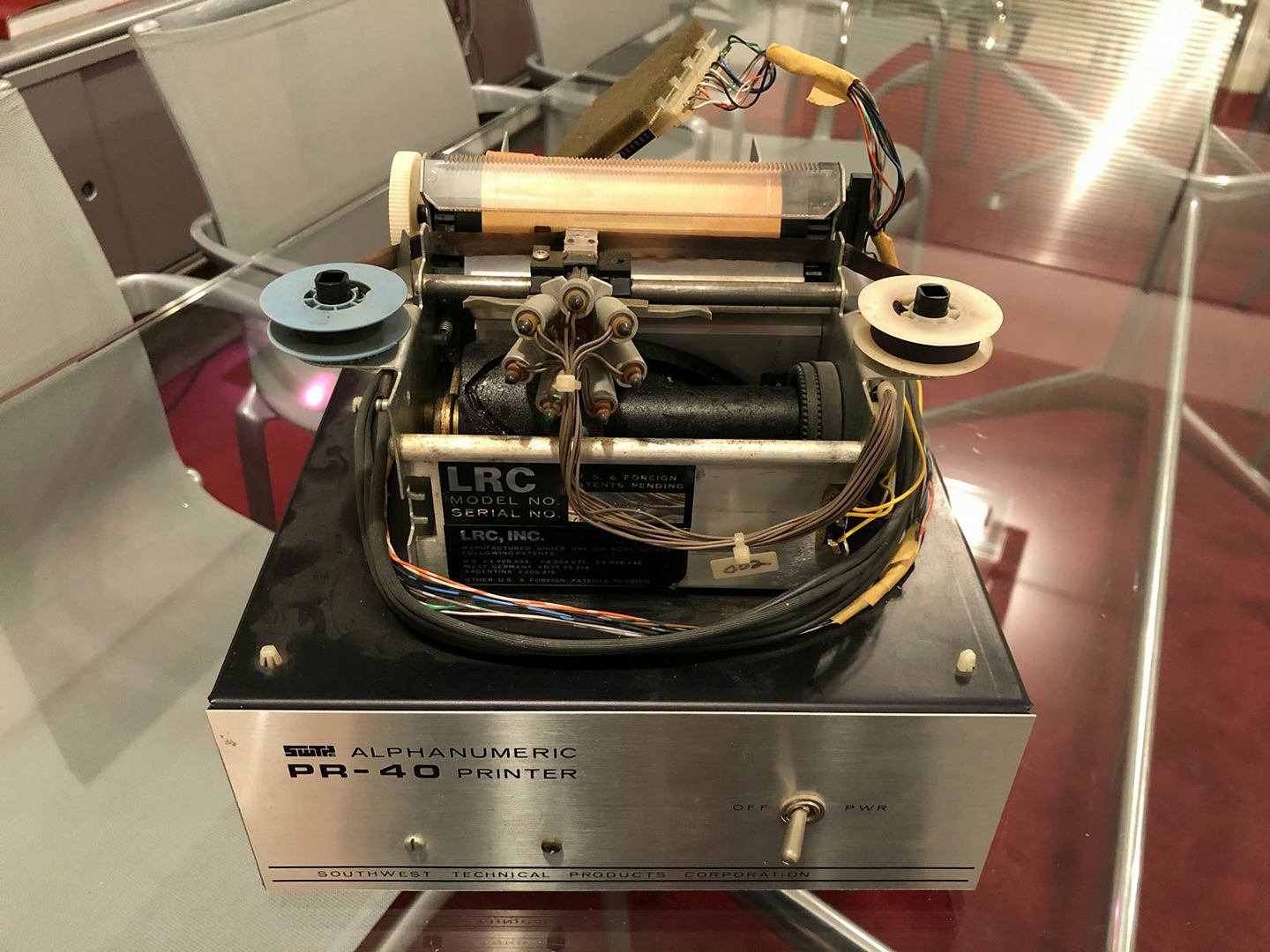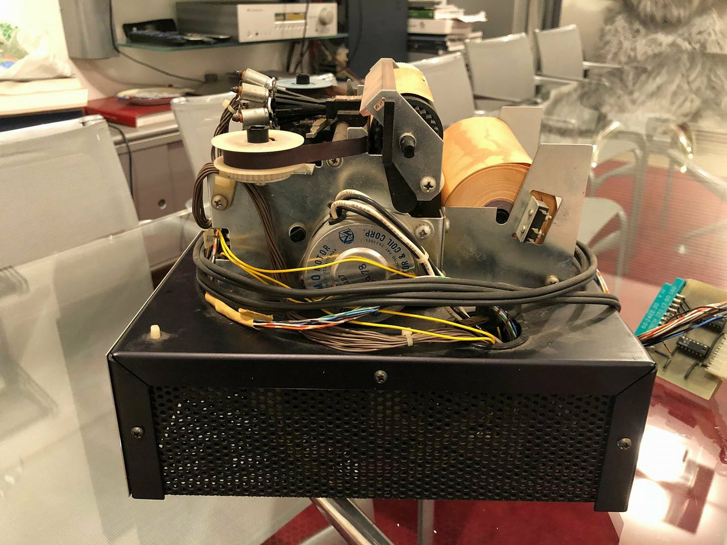 Datanetics keyboard DC900-0099-0 ASR 33 (CRT BD 02-1661-01 REV B) from May 28, 1976 with stamps 0023, DC Test, DC Test 2. Keyboard adapter. Sony 115 TV monitor. SWTPc PR-40 printer with silver front plate and black reel instead of white (could be a prototype). *Interface Age* magazine, September 1977, with full-page Apple ad.