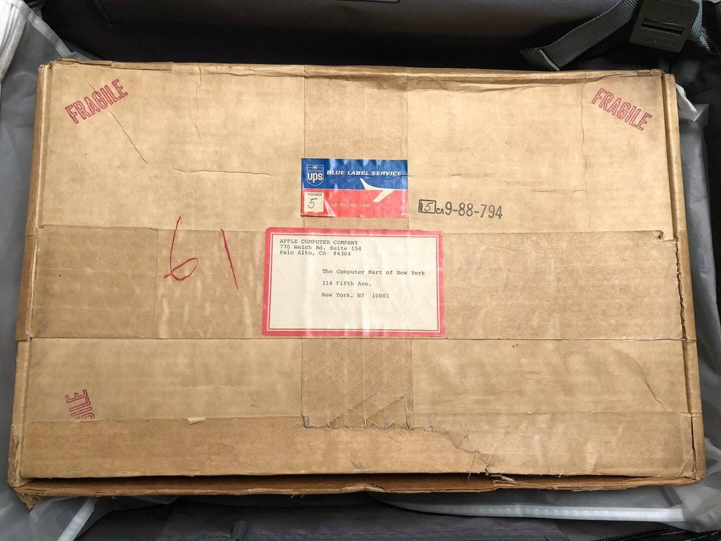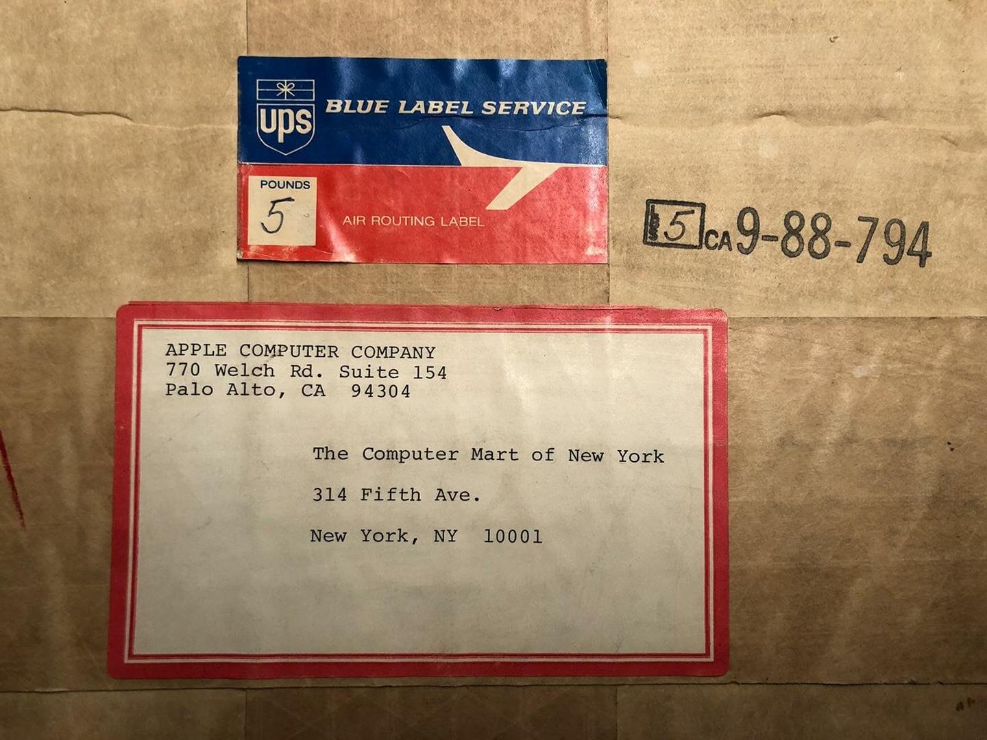 Original shipping box shipped to The Computer Mart of New York, 314 Fifth Ave. Sender is Apple Computer Company, 770 Welch Rd. Suite 154, Palo Alto, CA 94304.