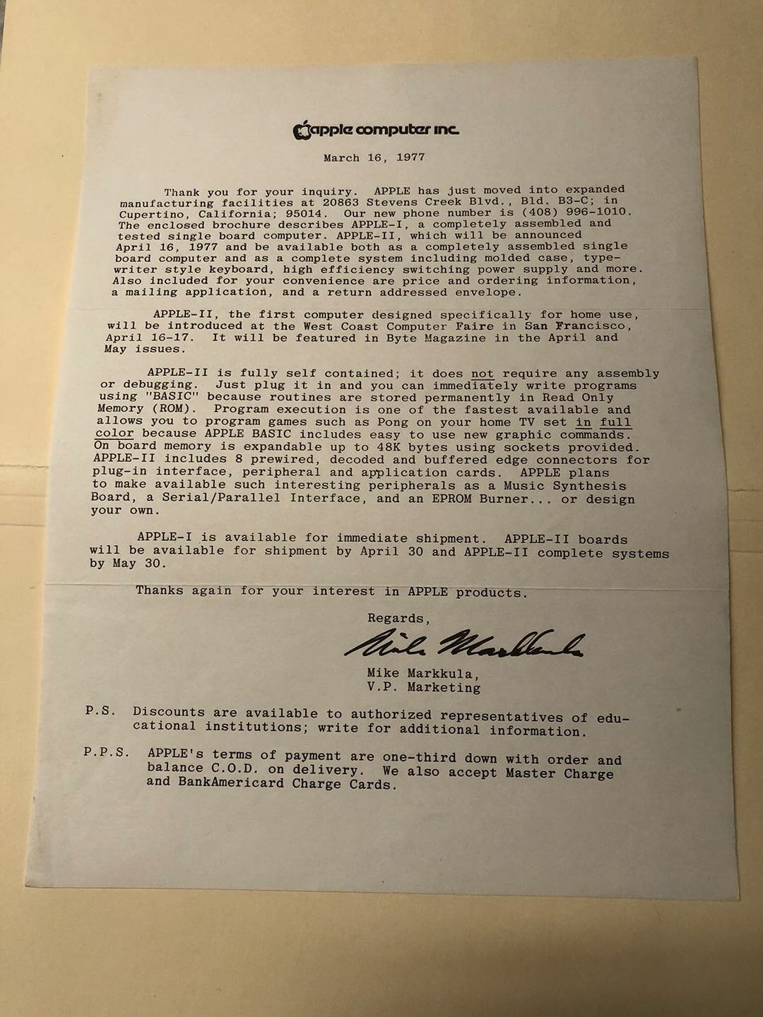 Letter from Mike Markkula (V.P. Marketing) dated March 16, 1977, about the Apple-II. The Apple-I would be available immediately, and Apple-II boards (!) would be available by April 30, 1977. Complete Apple-II systems by May 30, 1977.
