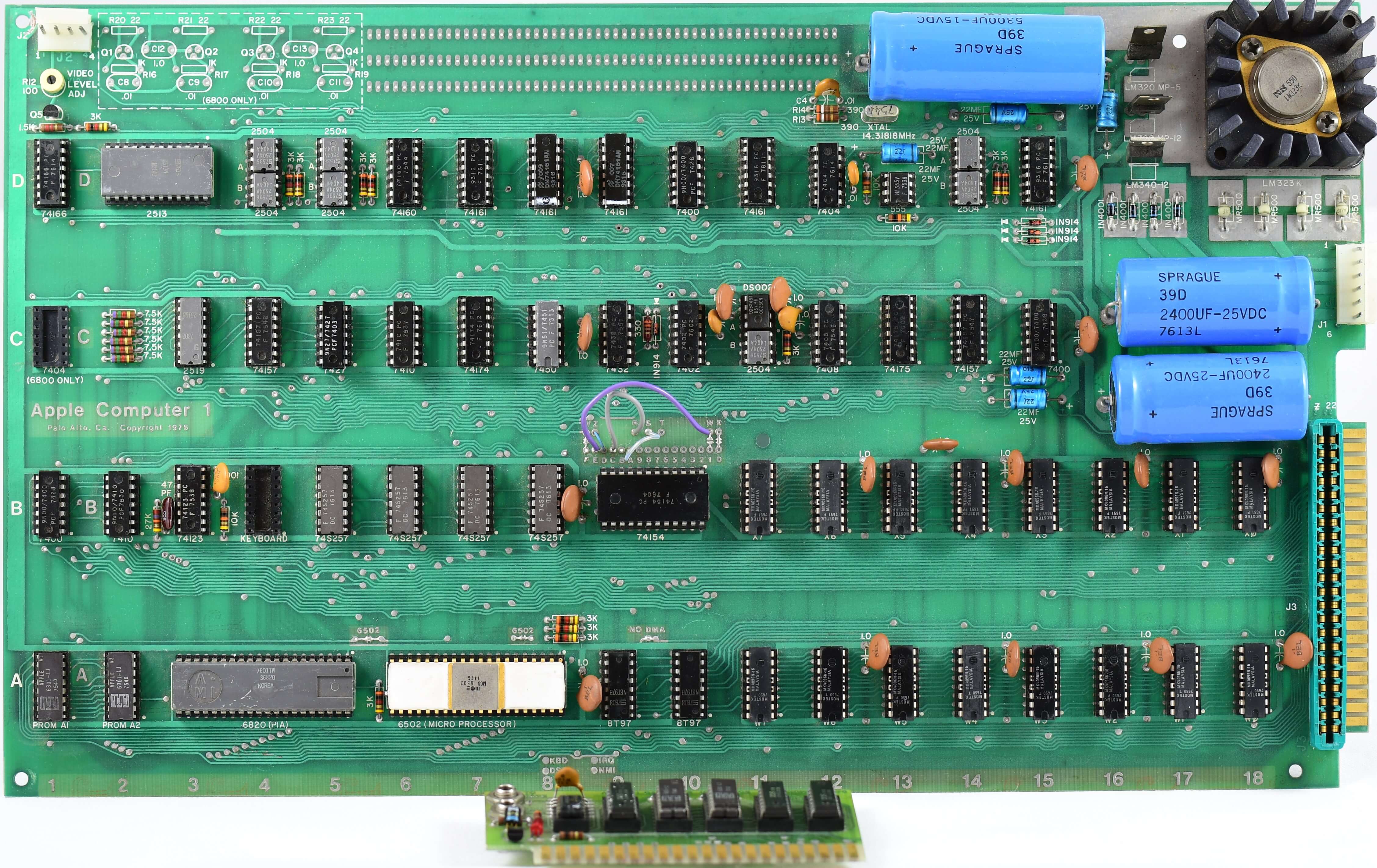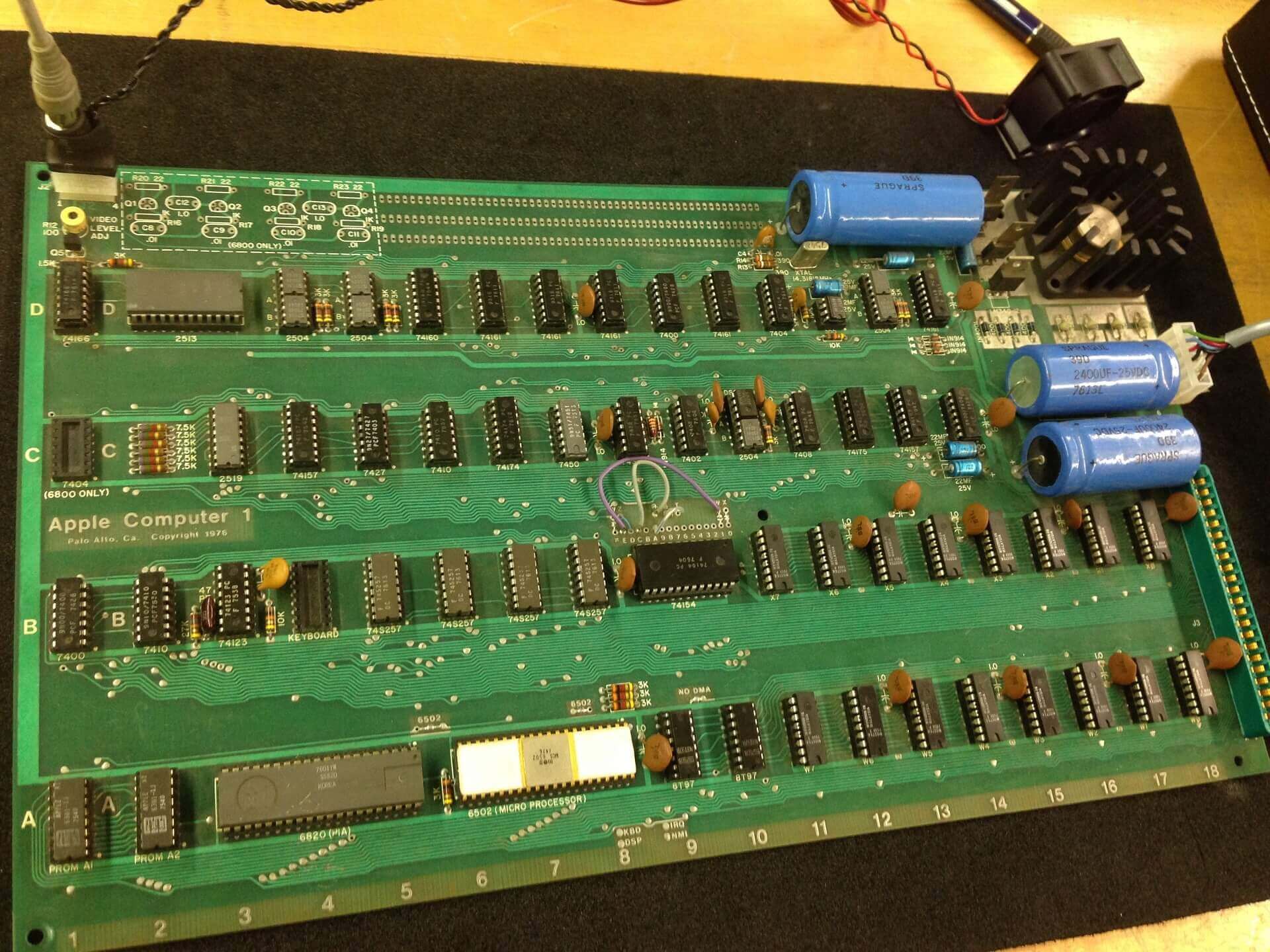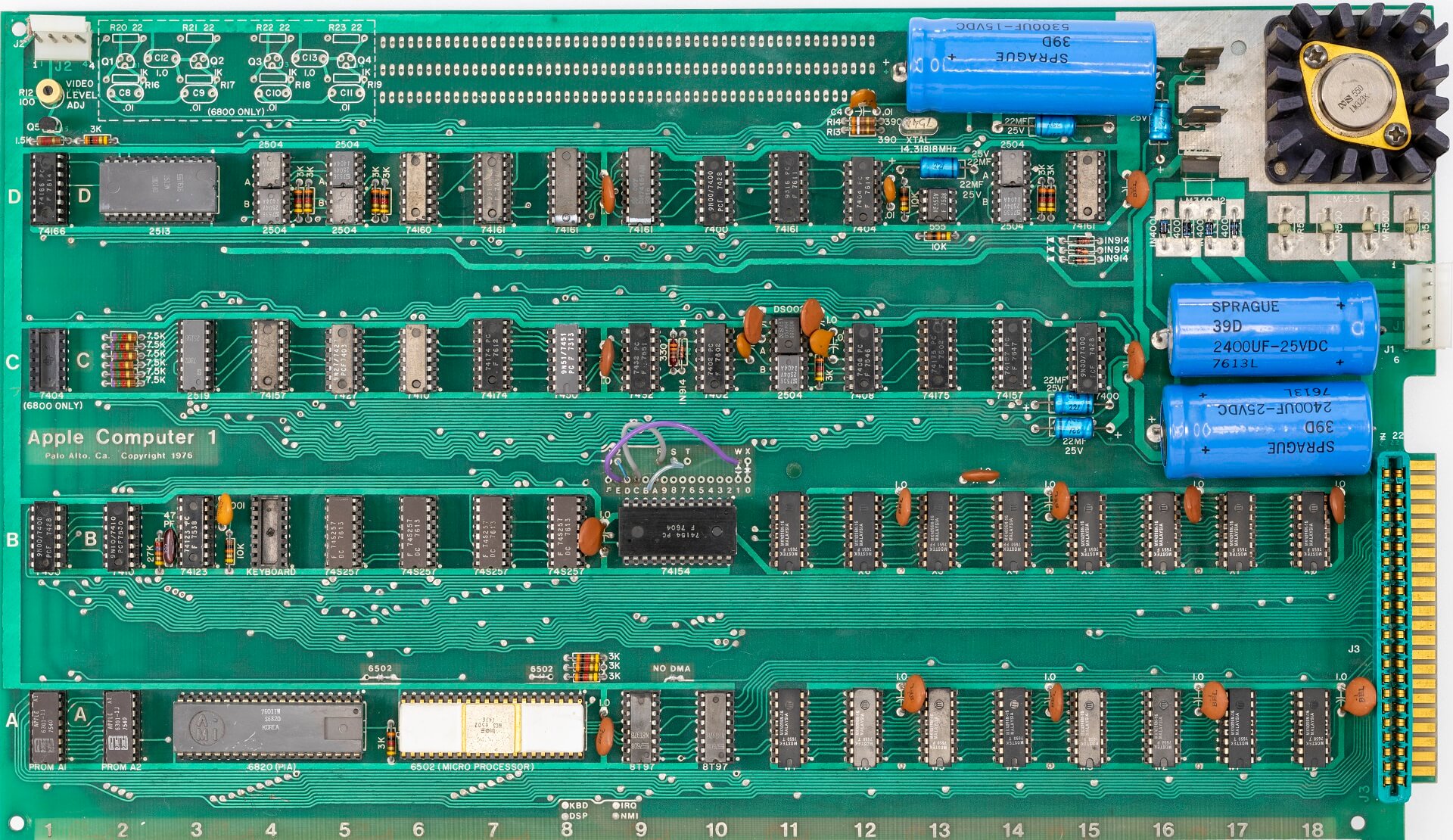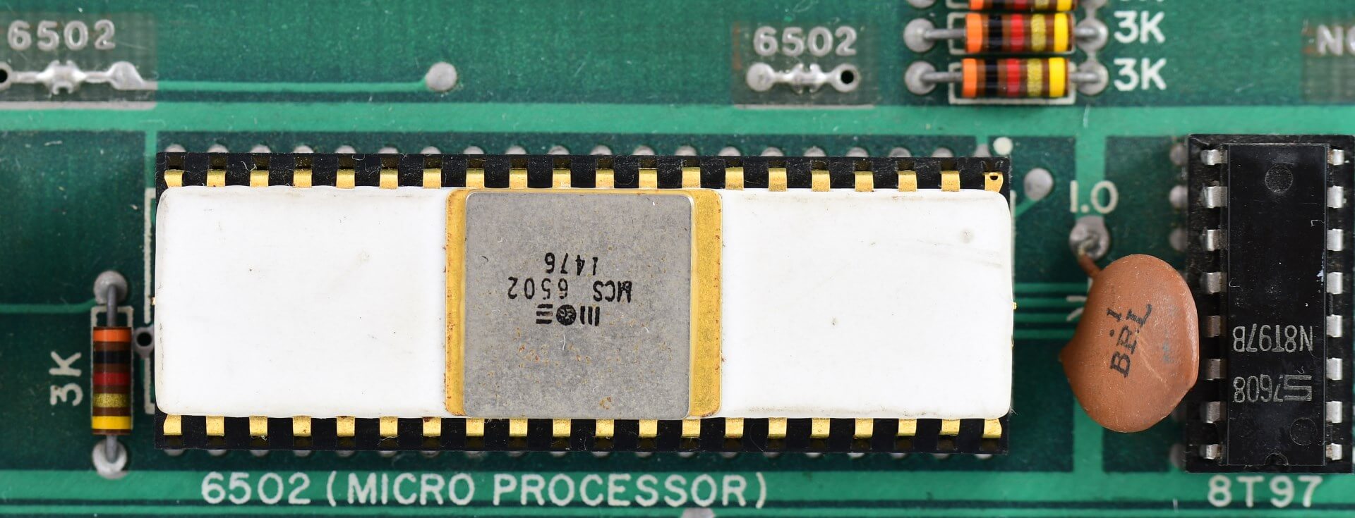 White ceramic MOS MCS 6502 CPU (1576), plastic AMI S6820 PIA (7601), 8 KB plastic RAM, all blue capacitors, original components.