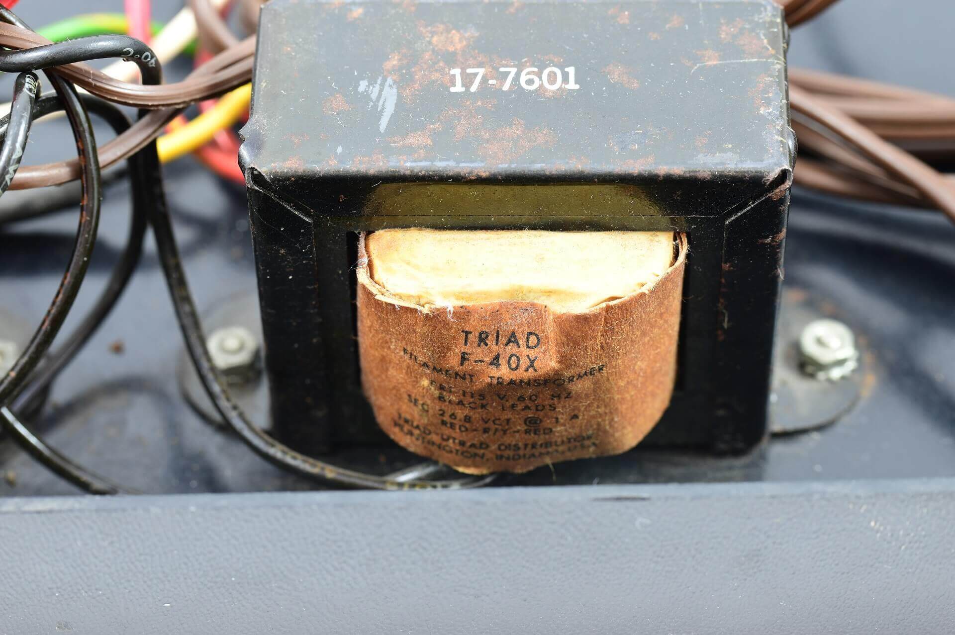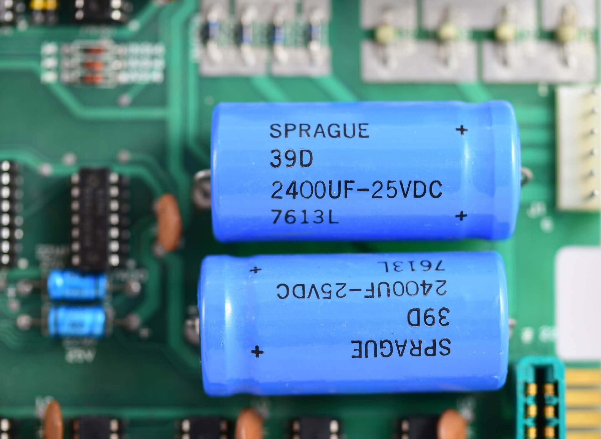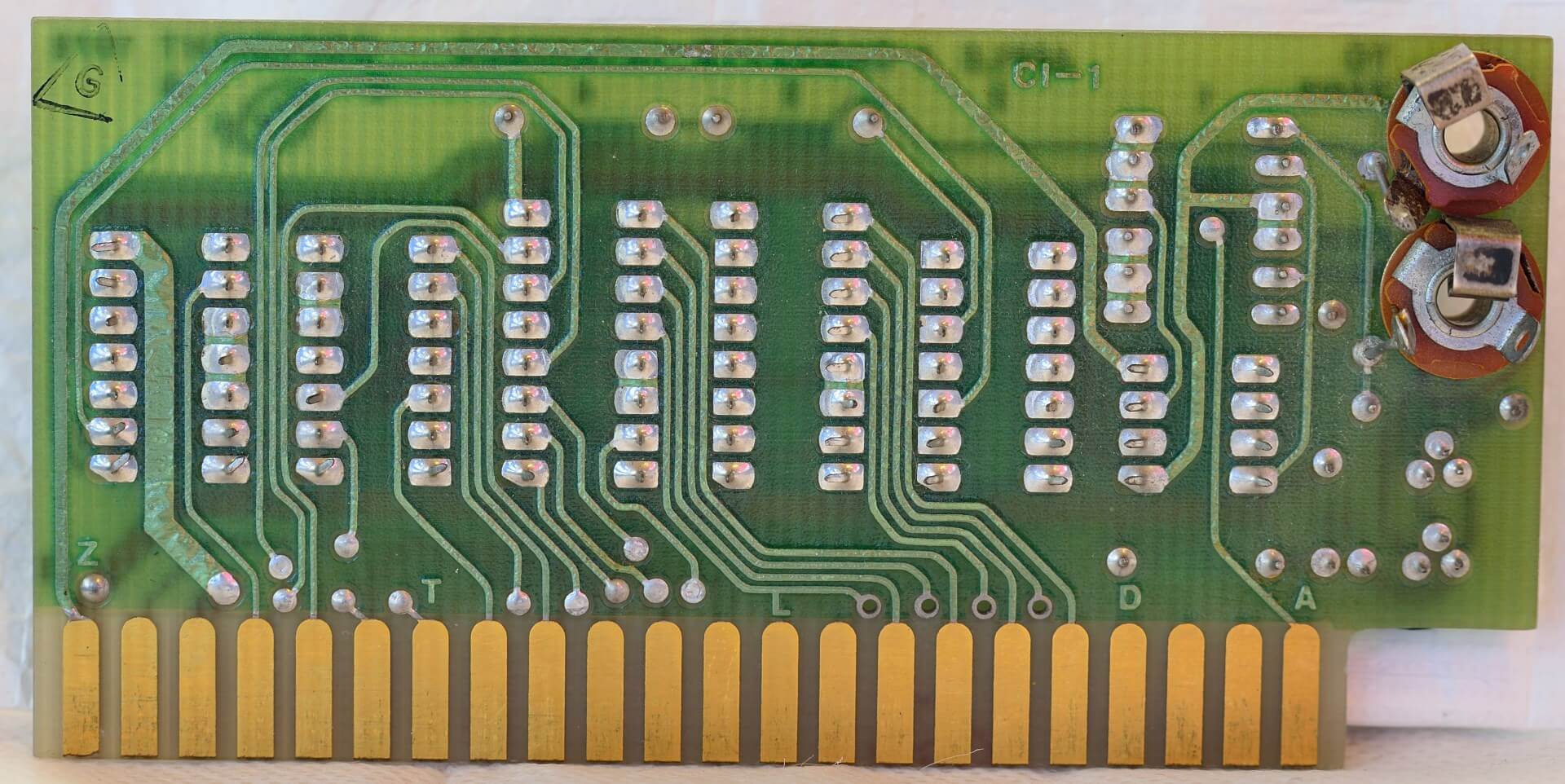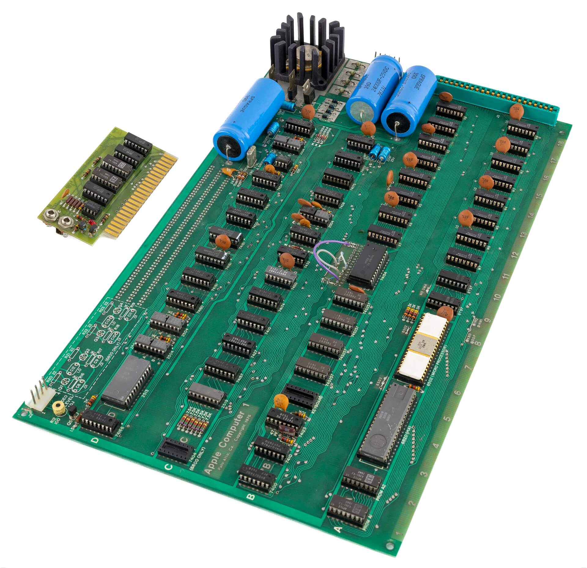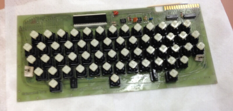 White ceramic MOS MCS 6502 CPU (1576), plastic AMI S6820 PIA (7601), 8 KB plastic RAM, all blue capacitors, original components.