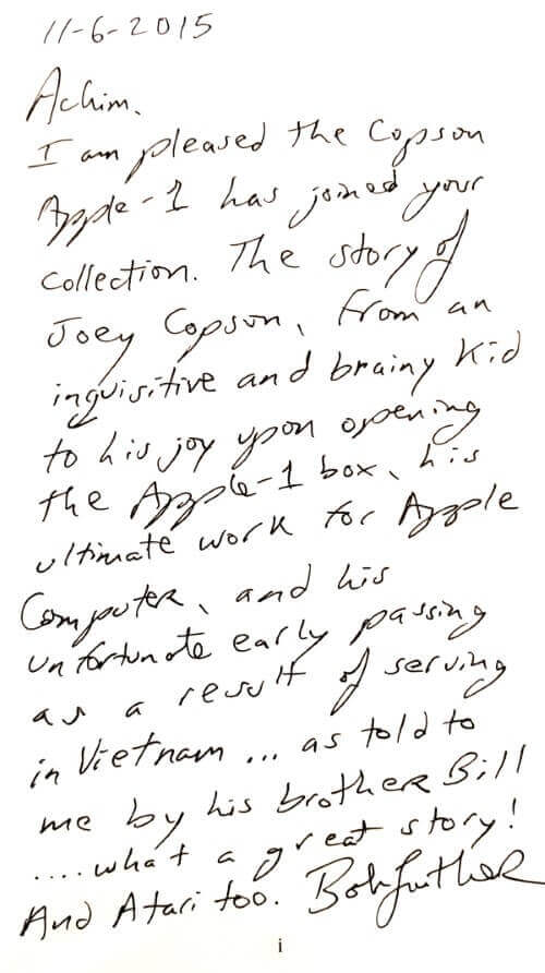 Joey Copson (California, USA) bought the Apple-1 directly from the Byte Shop in San Jose. The Byte Shop was a young computer shop and the first to offer the Apple-1 computer. The first 50 Apple-1s were sold there.