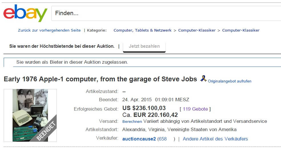 Bob Luther, the author of *The First Apple*, bought the computer after Joe Copson died from his brother. In 2015, the rare specimen changed hands for the last time at an auction. Achim Baqué from Germany was the winner. In 2017, he lent the Copson Apple-1 to the Deutsches Museum in Munich. The Apple-1 was provided free of charge for the exhibition; even transport and other costs were paid by the owner. Early 2022, the museum closed the exhibition, but the Apple-1 is on display again in the electronics department. In the meantime, the Apple-1 was taken by the owner for photos for a few weeks and then brought back to the museum.