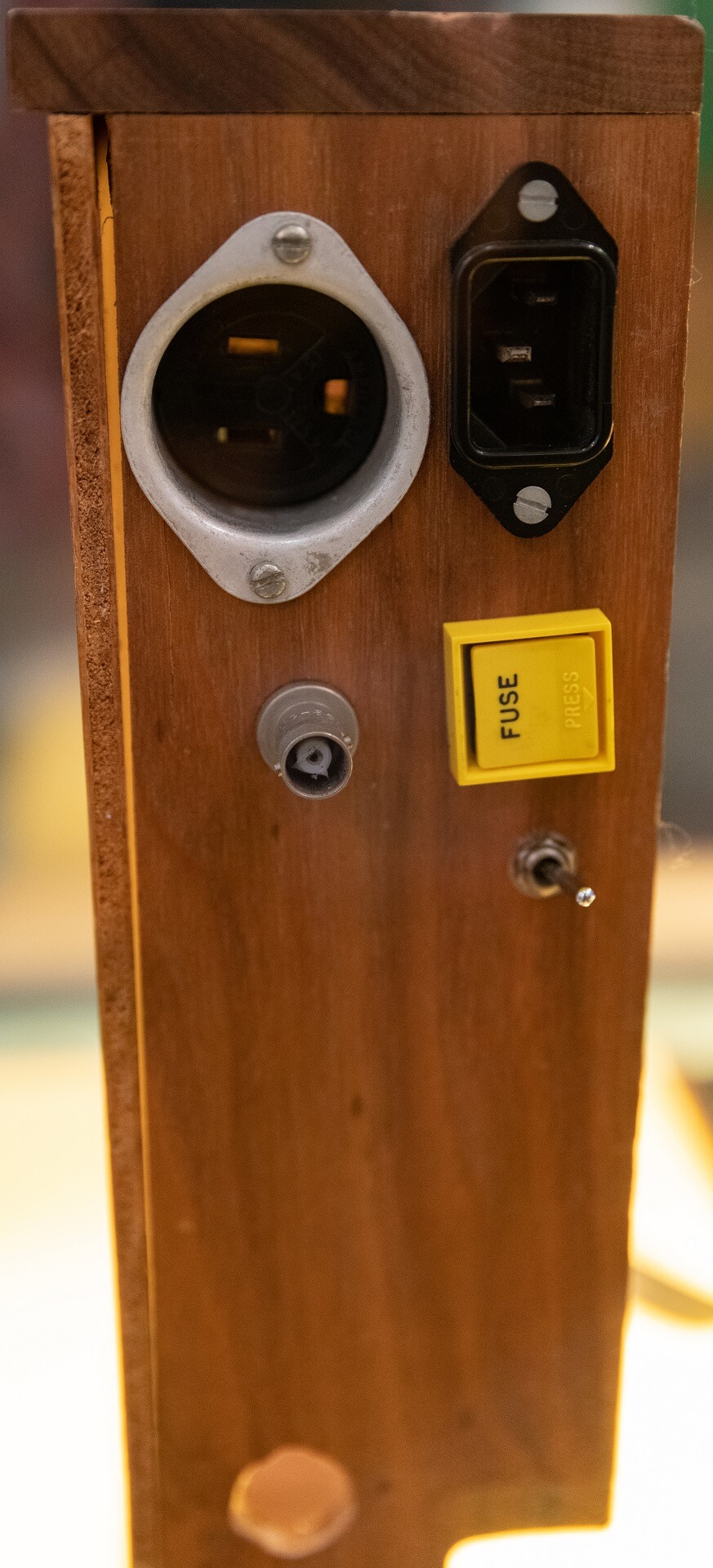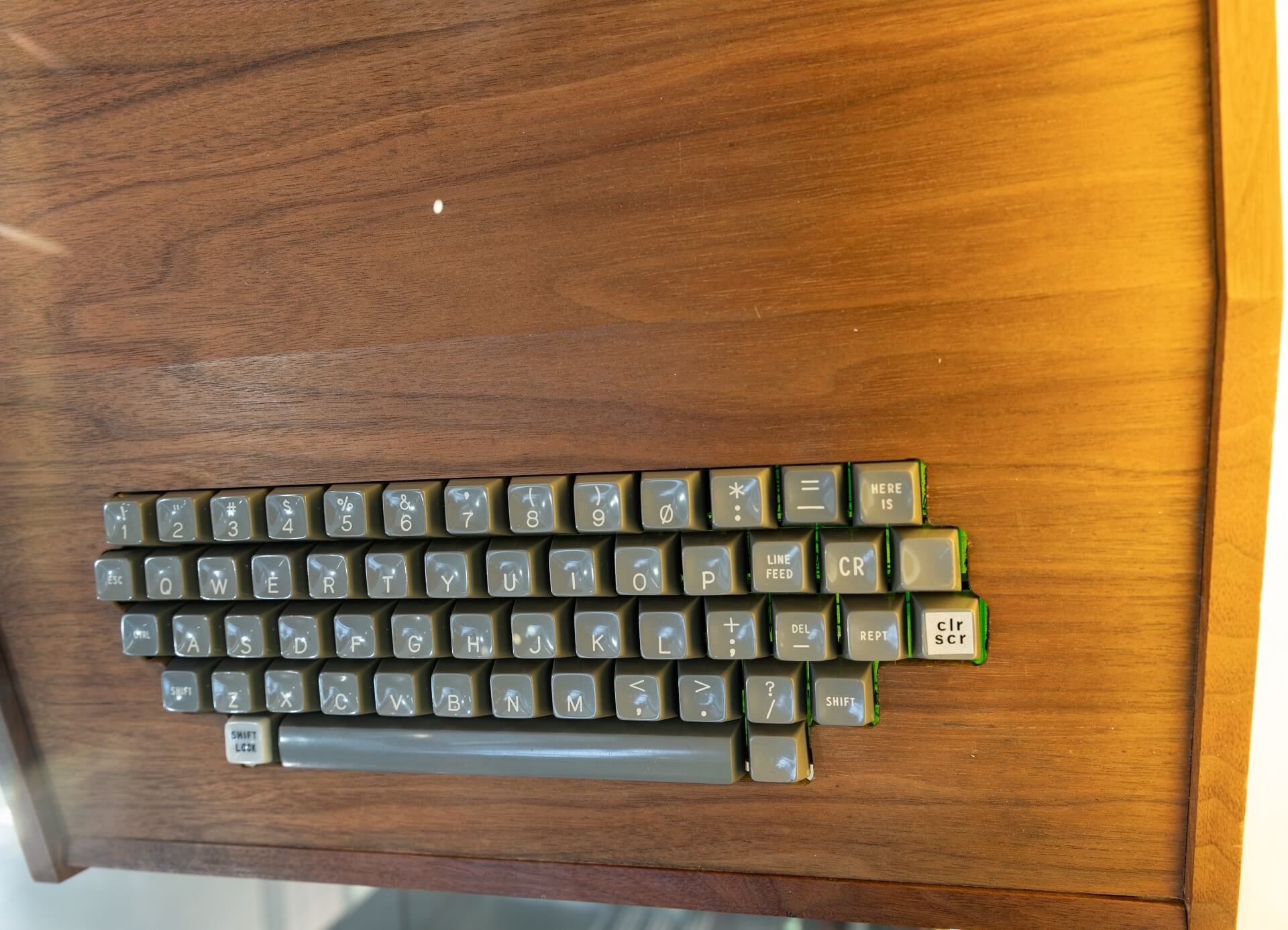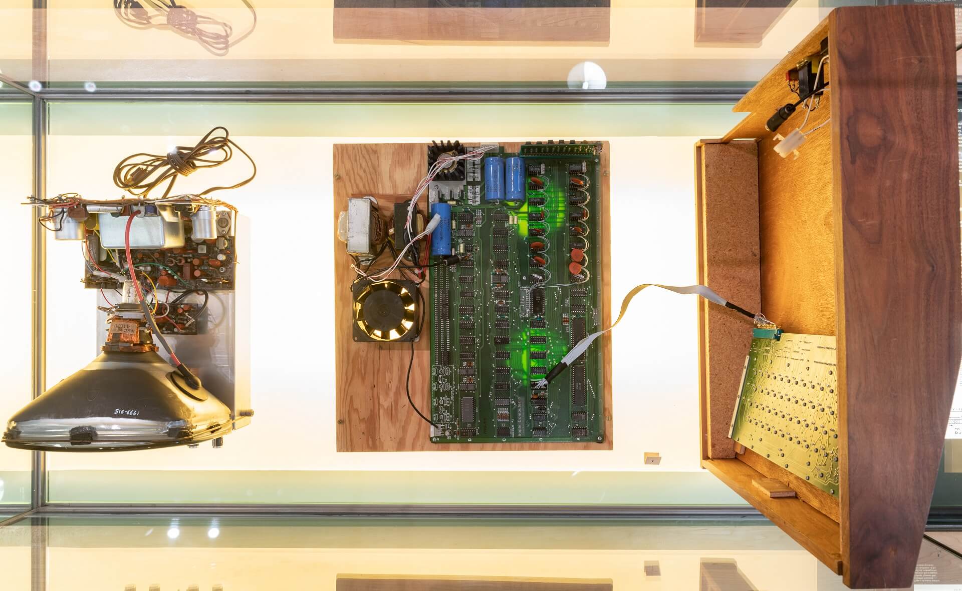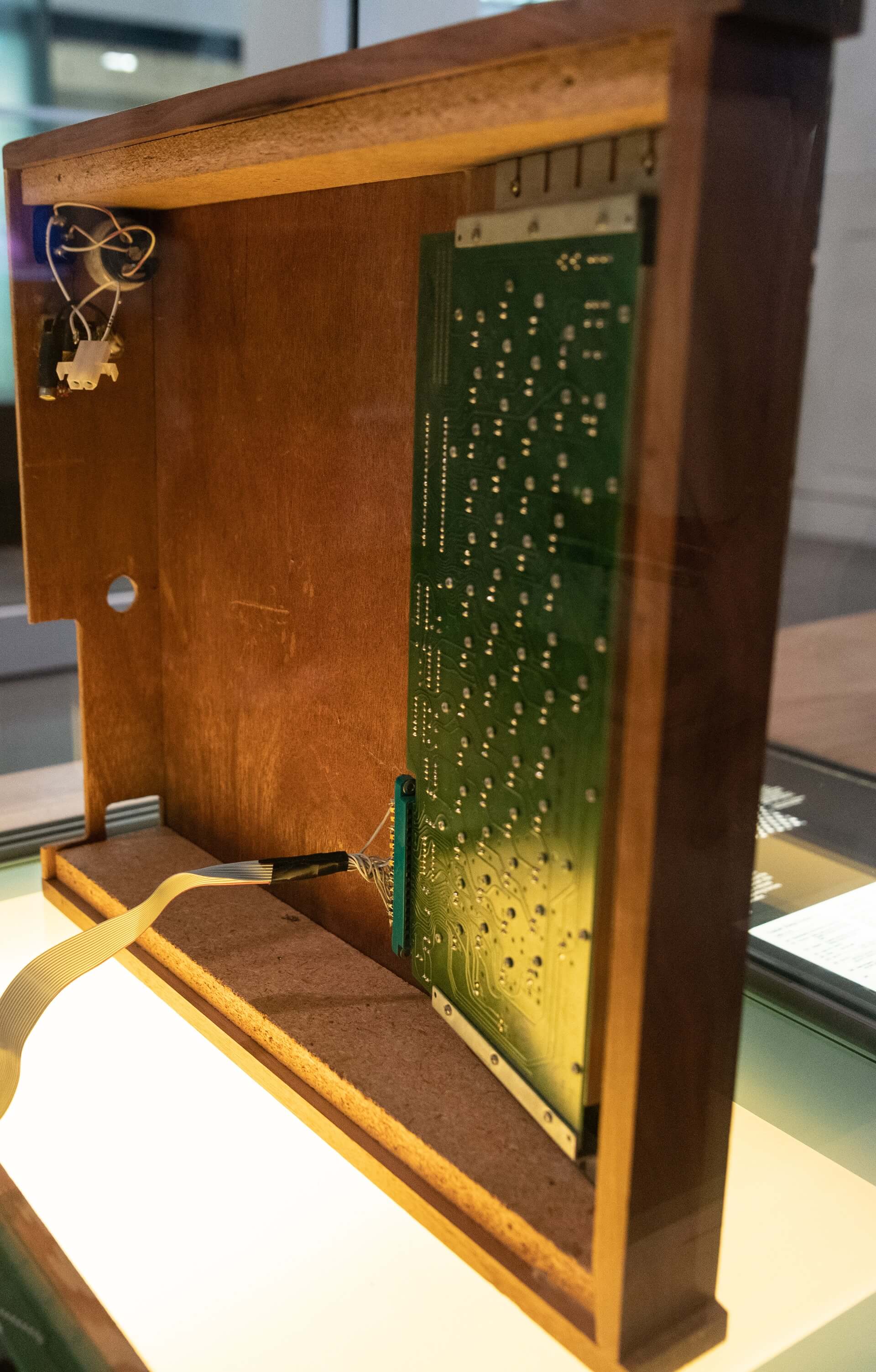 Original Apple Cassette Interface (NTI) with stamp '2' and handwritten number 1999-915 (probably by the museum). Wooden case with Datanetics keyboard, power supply, and fan. Monitor without case.