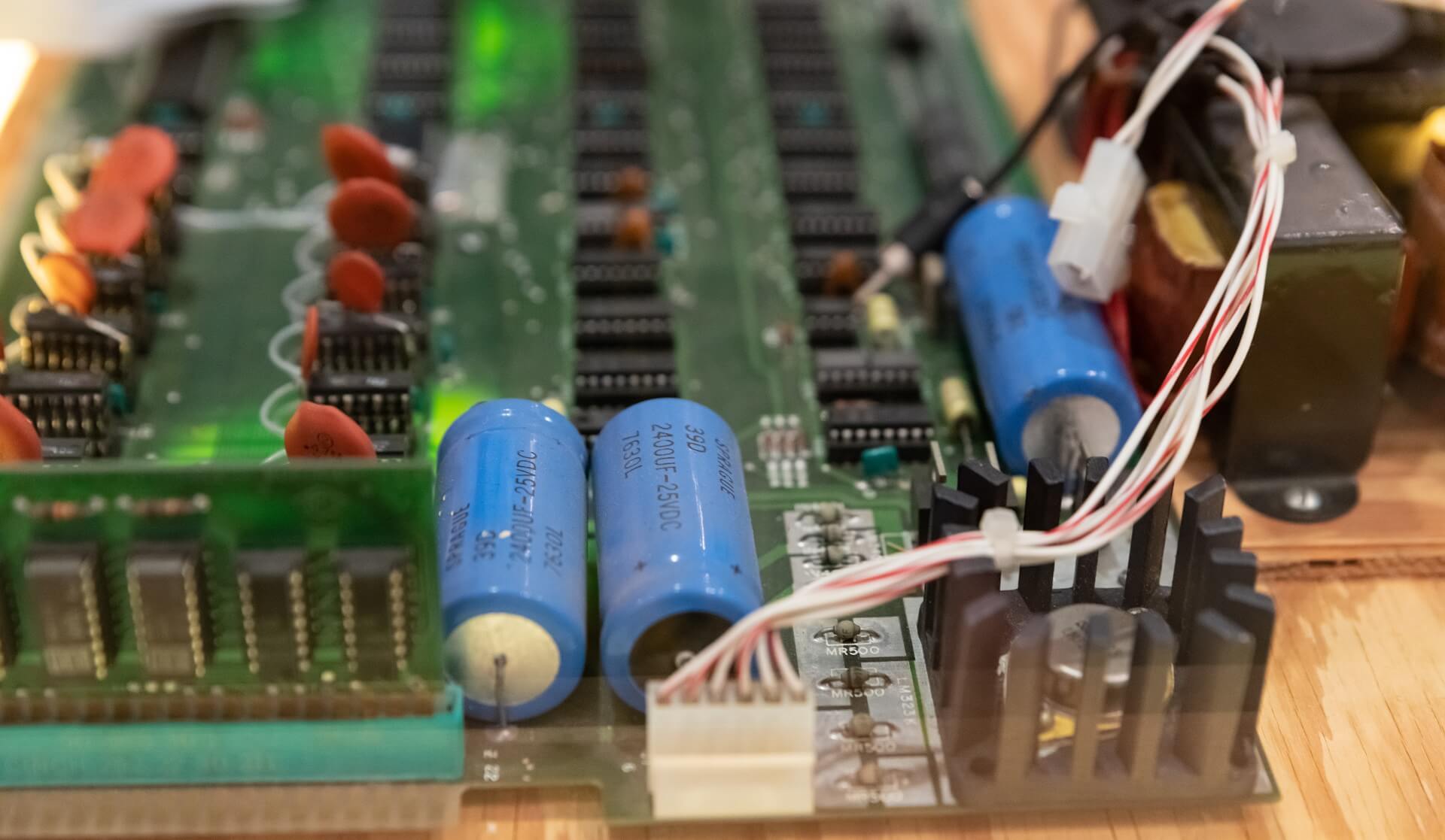 Plastic CPU MOS MPS 6502 (4076), plastic PIA Synertek SY6520 (7630), 32 KB plastic DRAM from Texas Instruments (7749). 5 yellow capacitors, 3 big blue capacitors.