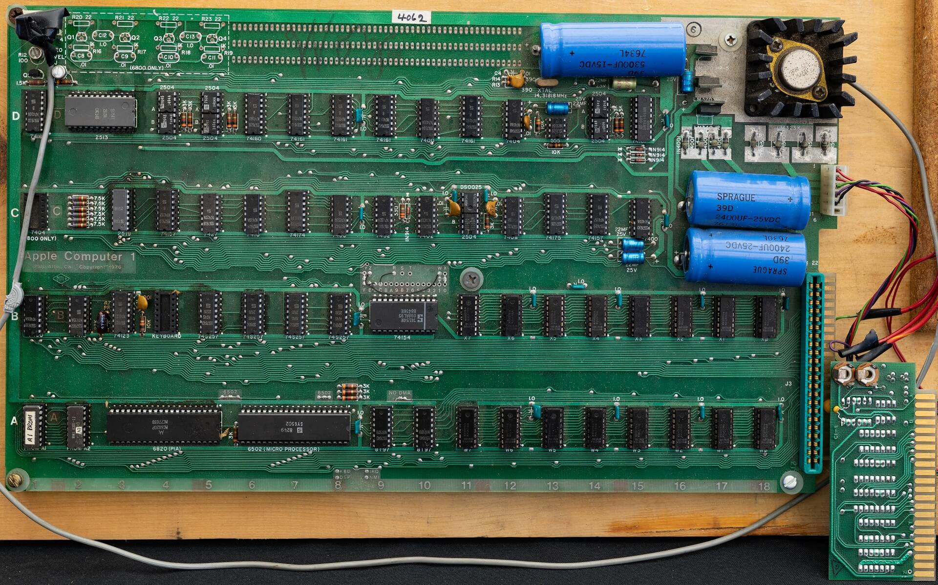 PROMs not original. Breadboard signed by Woz. It was probably an unpopulated mainboard. Mounted on a wooden panel.
