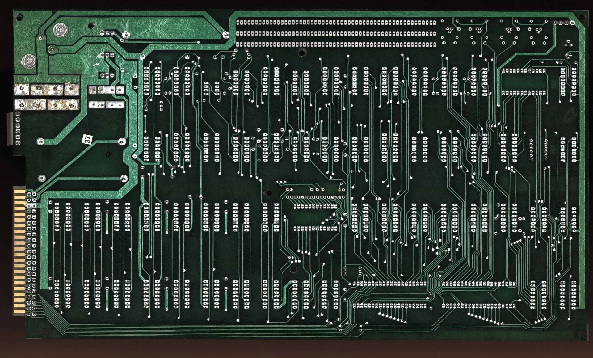 White ceramic Synertek C6502 CPU (7640), plastic MOS MPS 6520 PIA (0278), 8 KB plastic DRAM MK4096N-11 (7634). 3 small yellow capacitors, 2 small and 3 large blue capacitors.