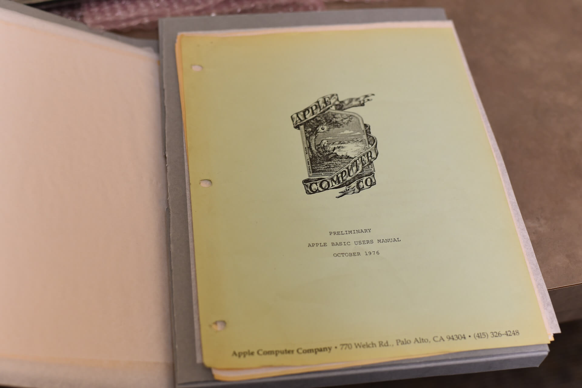 Original wooden case from Byte Shop with Datanetics Rev D keyboard from September 21, 1976, and power supply. Apple Cassette Interface. Operation Manual. Preliminary BASIC Manual.