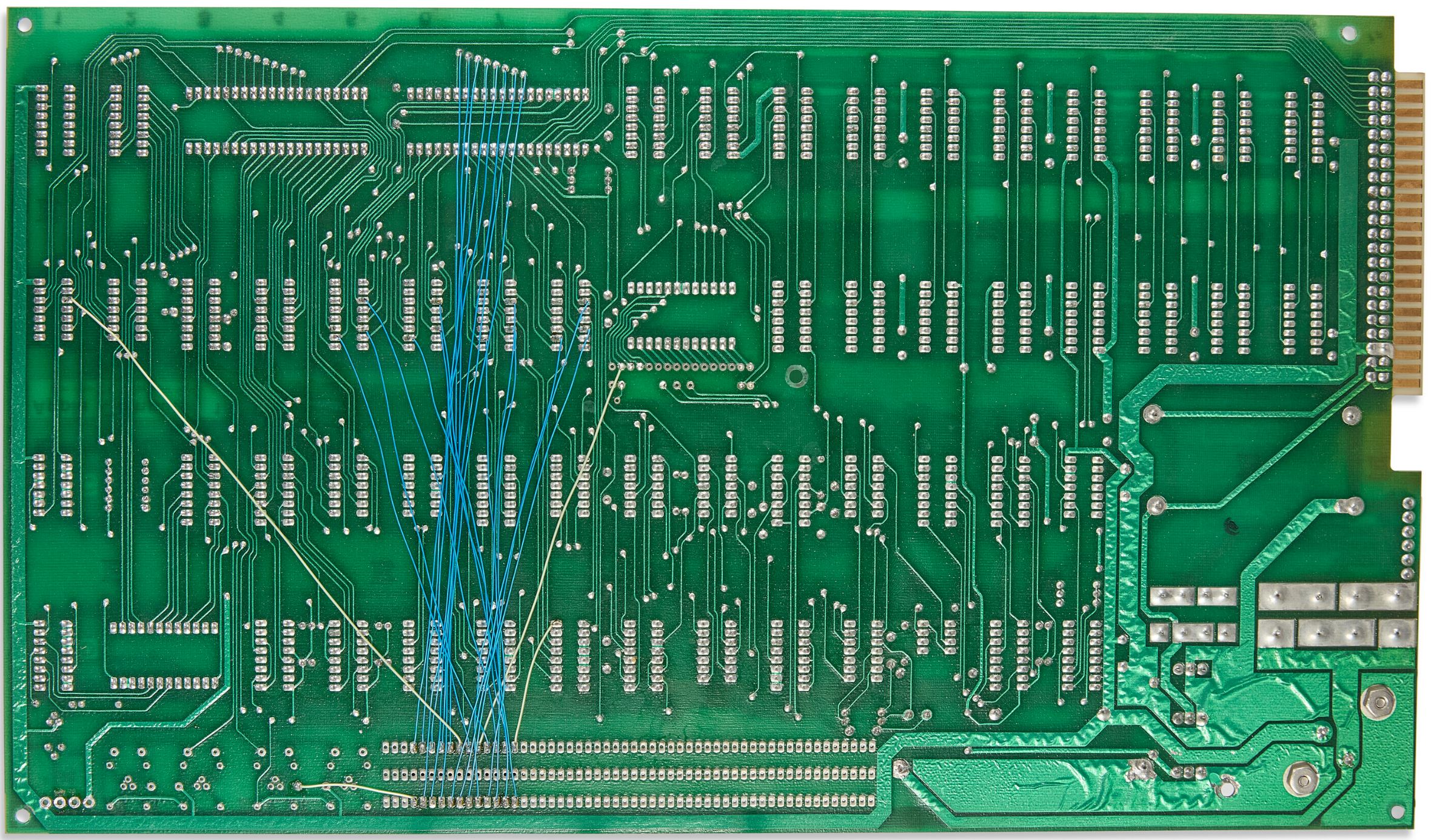Added EPROM at breadboard (by Daniel Kottke). Wires on the back. Video connector is missing. Video cable soldered to the mainboard. Two additional heatsinks attached to voltage regulators.