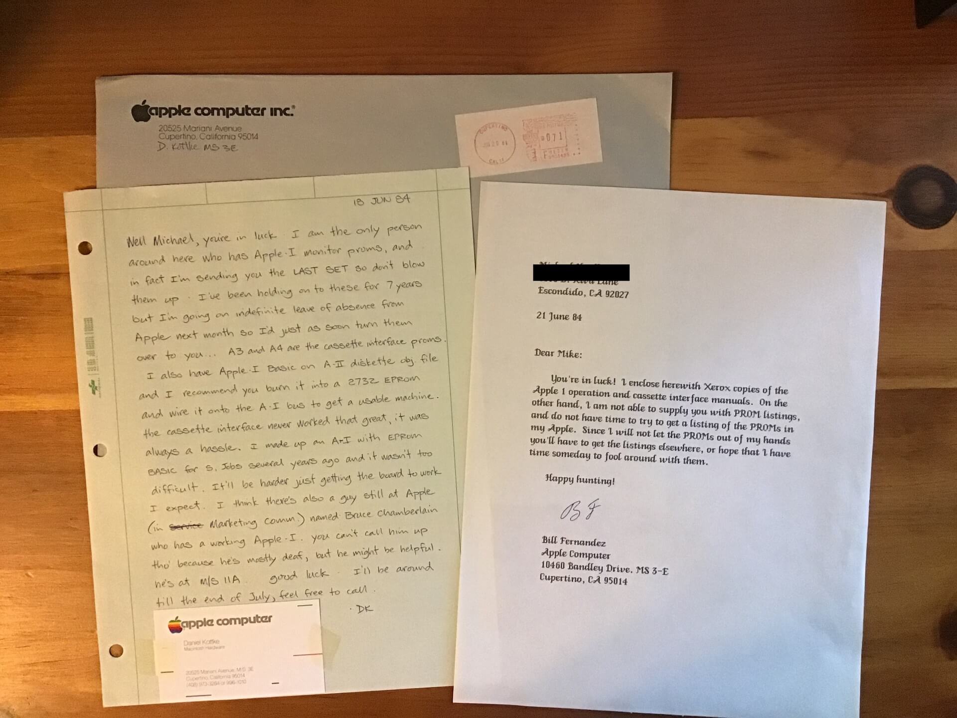 I wrote to Bill Fernandez, Apple employee #4, in June of 1984 who sent me Xerox copies of his Apple-1 documentation which were much better copies than what I had. He said he could not supply the Programmable Read Only Memory (PROM) listings because, “I do not have time to get a listing of the PROM’s,” and “I will not let the PROM’s out of my hands.” But I thanked him for the nice looking docs.