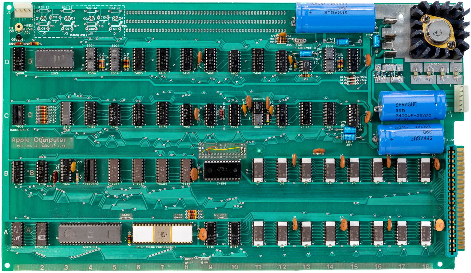White ceramic MOS MCS 6502 (1576) CPU. Plastic AMI S6820 (7601) PIA. Some chips have been replaced (7410, 74166, 2513). White ceramic DRAM from 1977. Modern L7905CV regulator.