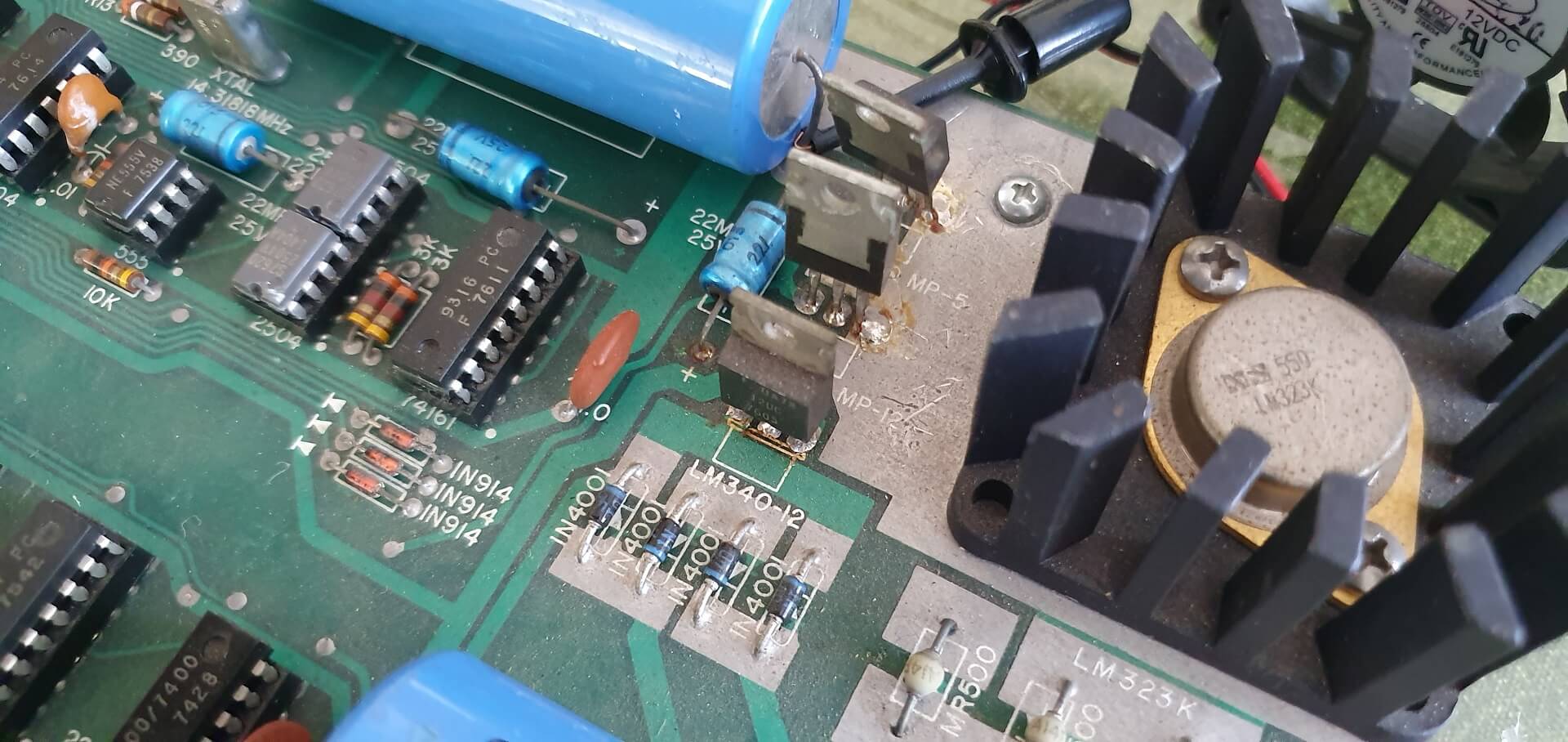 This particular unit does not have the proper jumper wire to use a cassette interface card. The seller then proceeded to repair his second board. He found a non-vintage -5V regulator and installed it. He also found and replaced another bad logic chip. This board had the proper jumper for running a cassette interface card. With Internet searches more 4k memory chips in the white ceramic packages from the same manufacturer with similar date codes were found and installed into the tagged computer. Wendell sent several digitized audio files of the Apple 1 Basic which after considerable effort and troubleshooting were loaded into memory and run. It was found that the proximity to a high-power radio station transmitter was creating enough electrical interference in the boards that the cassette interface cards would not work. The power mains were picking up high levels of radio frequency interference. The solution was to install an AC power line filter and improved grounding.