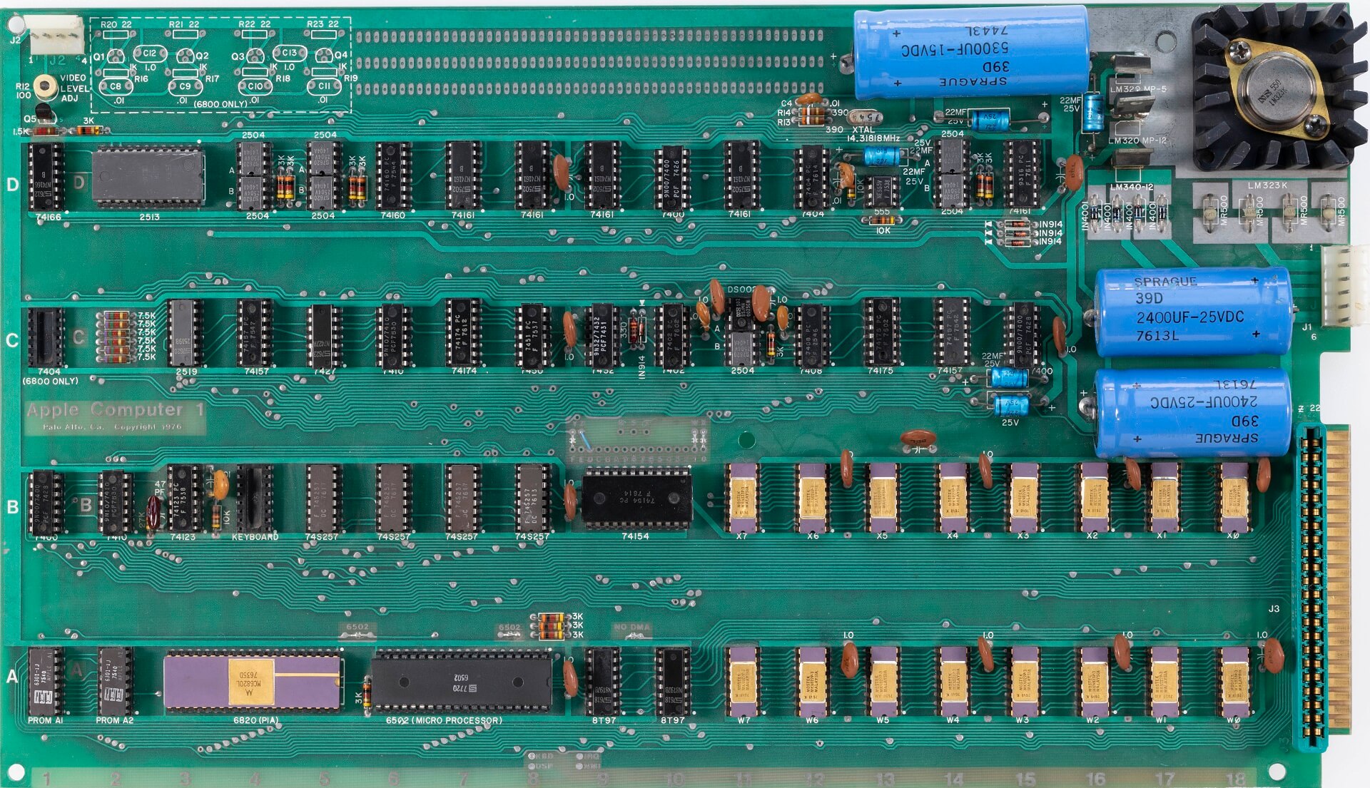 Plastic Synertek 6502 (7720) CPU. Purple ceramic MC6820L (7635) PIA. Some chips, including the voltage regulators, have been replaced. All capacitors are blue. Mostek MK4027P-3 DRAM from ’76.