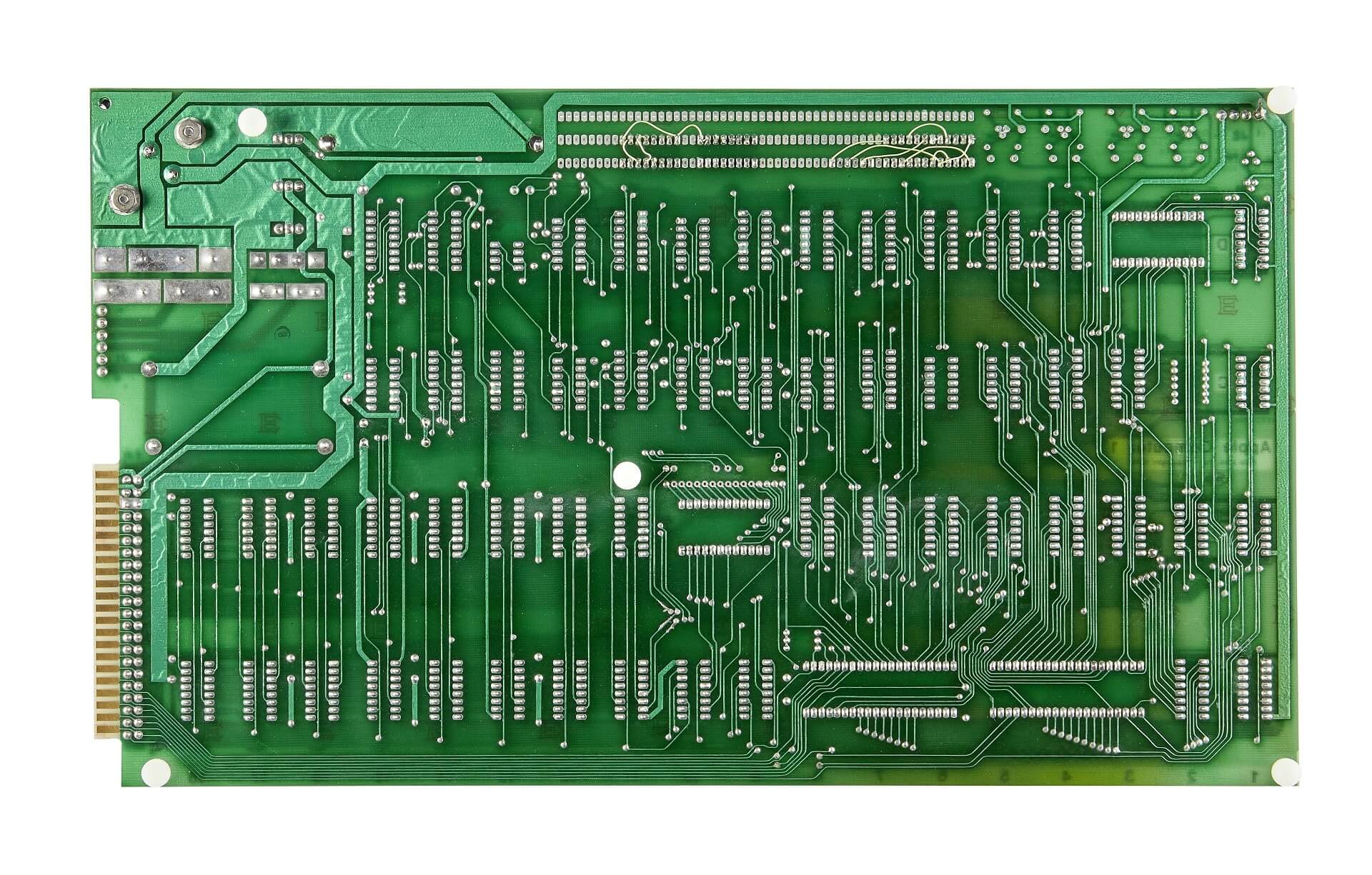 White ceramic CPU MOS 6502 (3776), plastic PIA Synetics SY6520 (7630), 8 KB ceramic DRAM (not original, wrong date code 7702). Seven blue capacitors, one yellow capacitor.