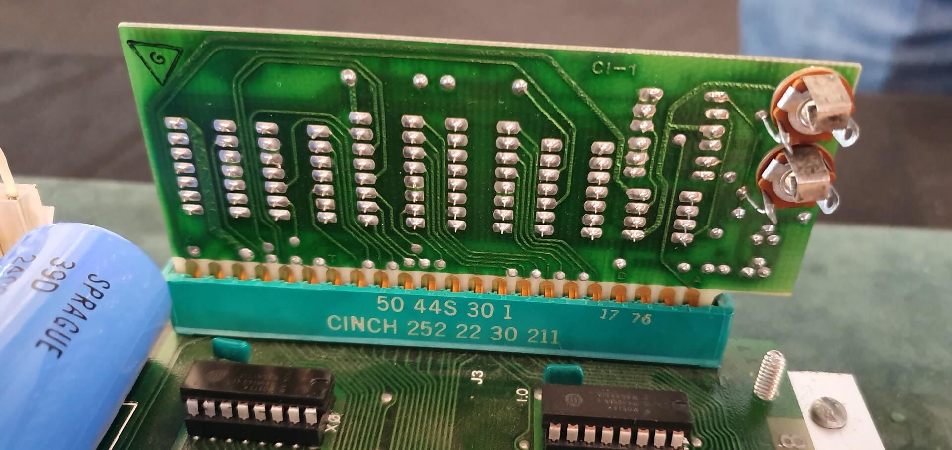 White ceramic Synertek C6502 CPU (7643), plastic Motorola MC6820L PIA (7730). 8 KB Mostek DRAM MK4096N-15 from 1976 and 1977. Three blue and four yellow capacitors.