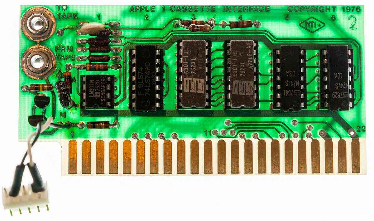 Original Apple Cassette Interface (NTI), original wooden Byte Shop case with Datanetics keyboard from Dec 14, 1976, and power supply from 1976, period-correct cassette with Basic and Disassembler. Original Apple Cassette Interface Manual, original Apple ad, Panasonic cassette recorder.