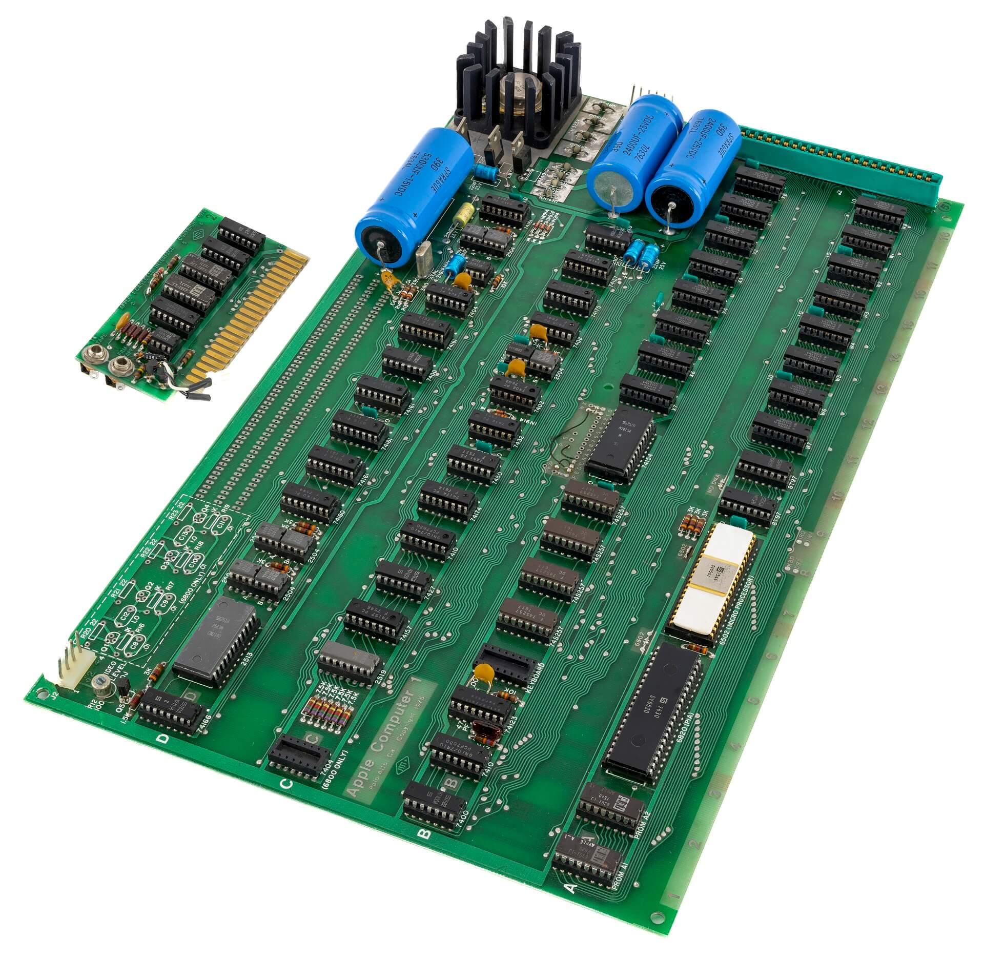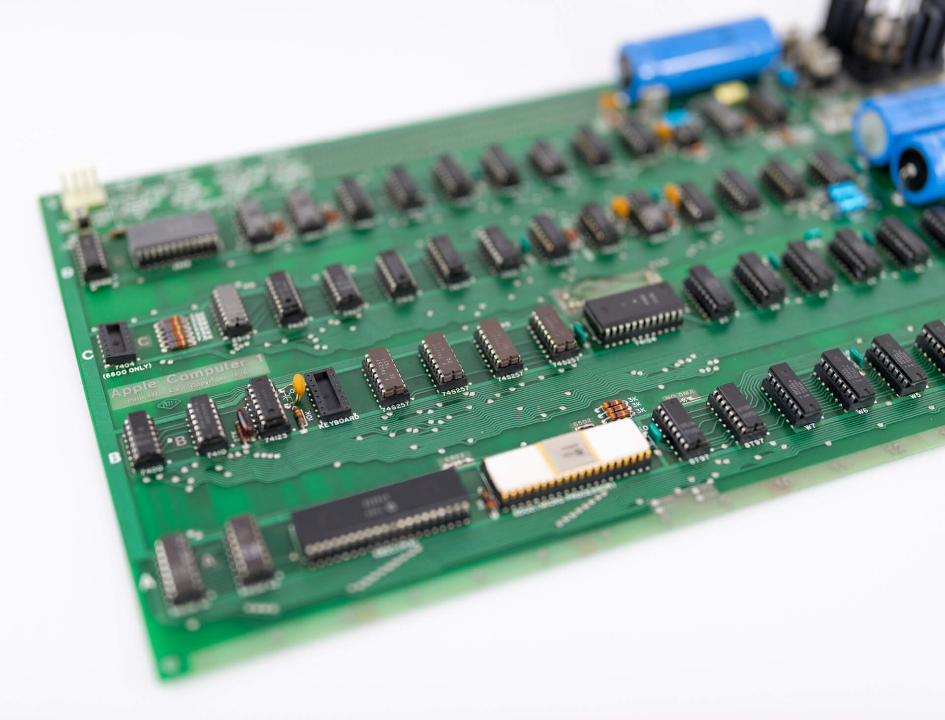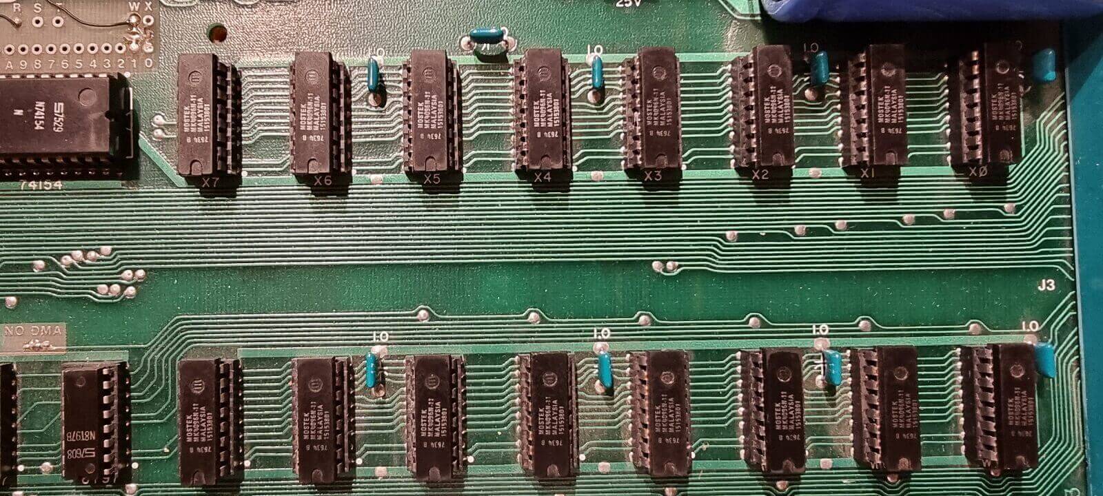 White ceramic Synertek CPU C6502 (7541), plastic Synertek PIA SY6520 (7630), 8 KB Mostek MK4096N-11 (7634). All chips are date-correct. 6 blue and one yellow caps