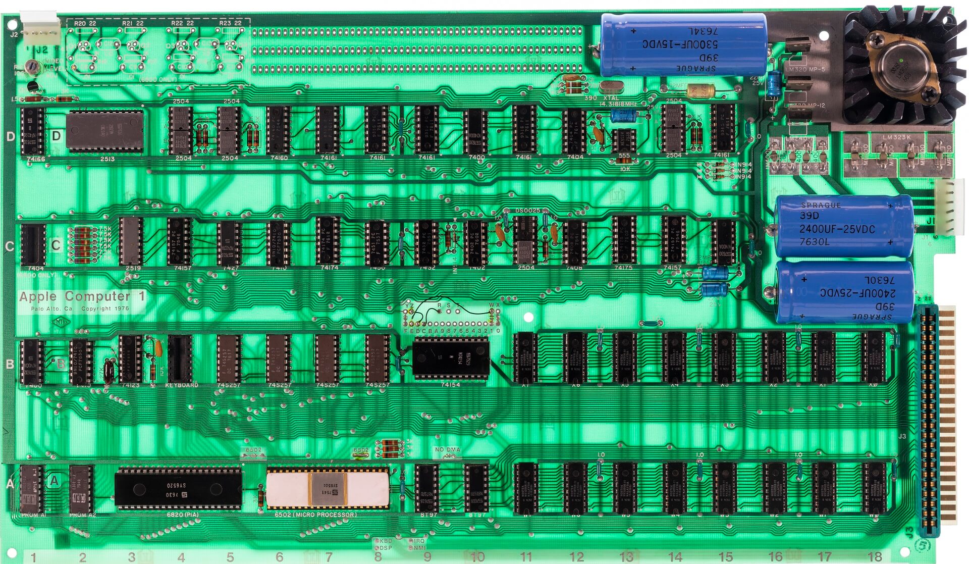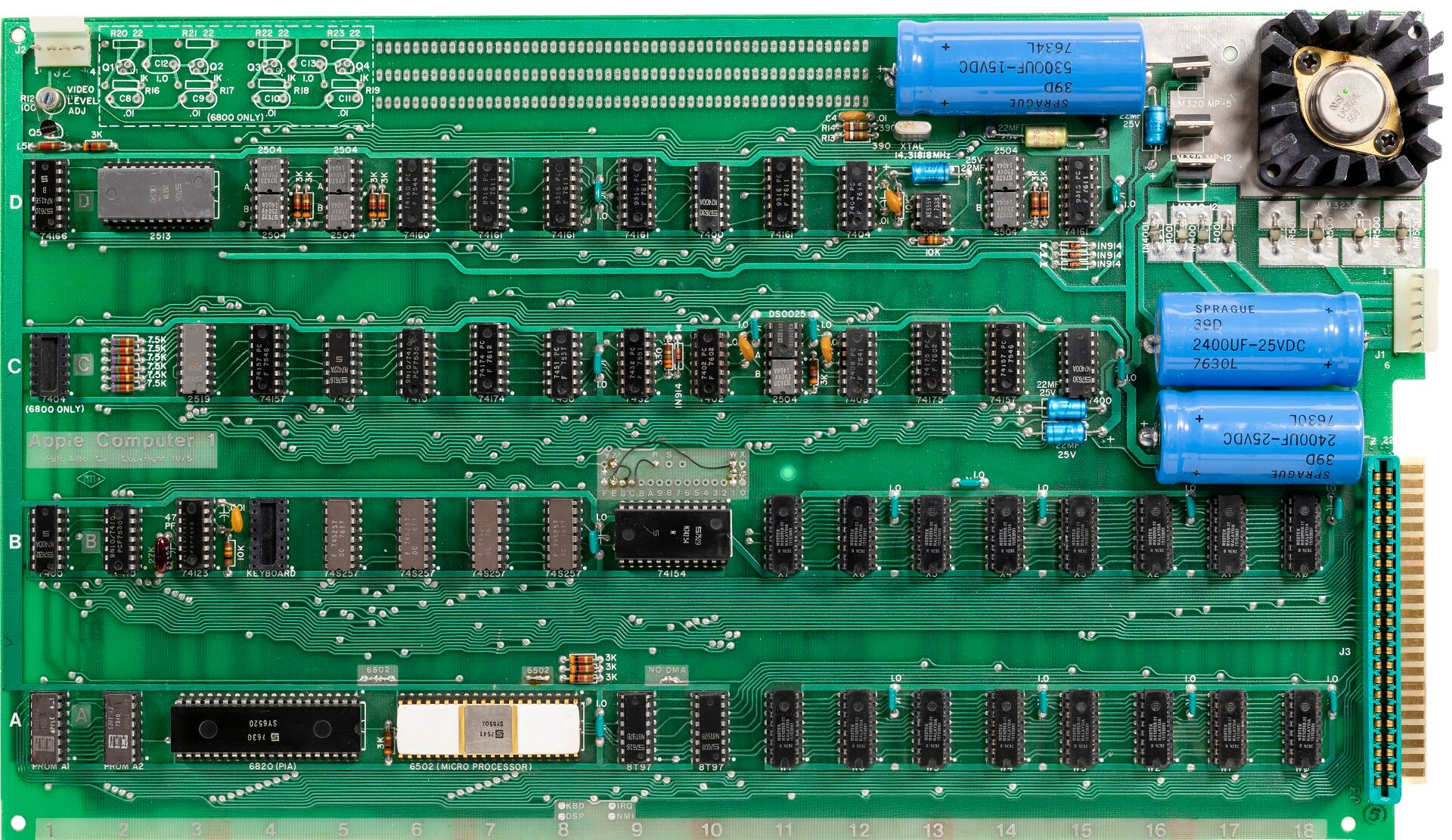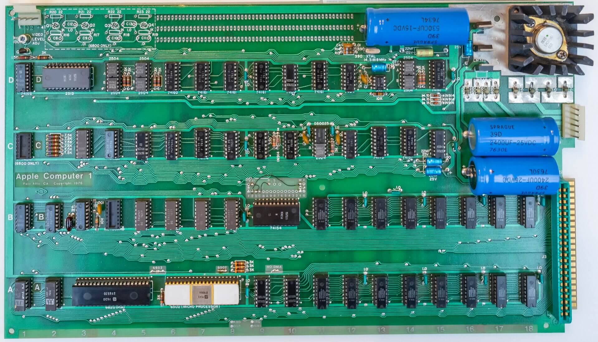 White ceramic Synertek CPU C6502 (7541), plastic Synertek PIA SY6520 (7630), 8 KB Mostek MK4096N-11 (7634). All chips are date-correct. 6 blue and one yellow caps