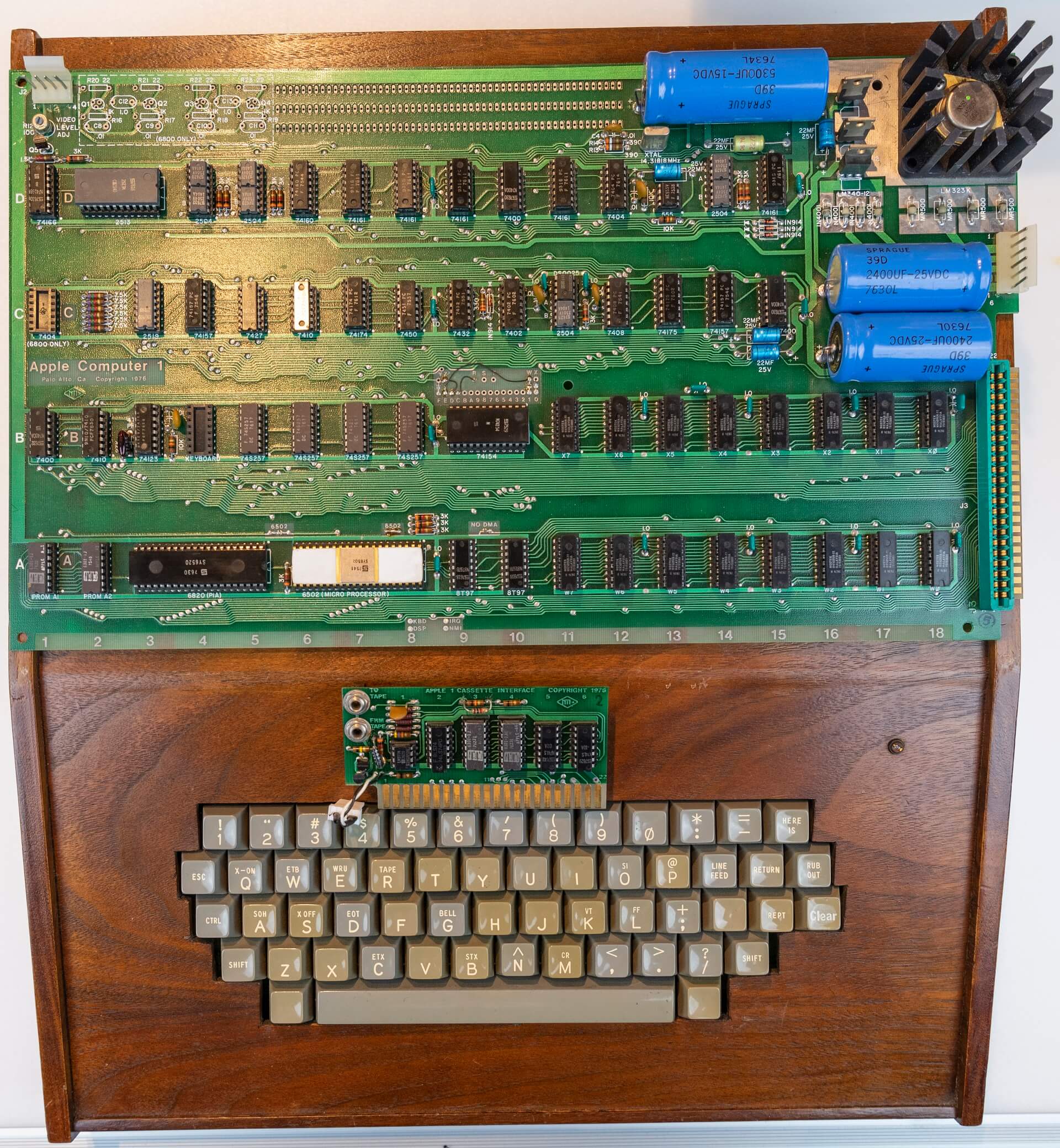 Operational Apple-1 “NTI” computer including the original Apple-1 “NTI” board, original Apple Cassette Interface (ACI) "NTI," and original wooden Byte Shop Apple-1 case with Datanetics keyboard and power supply.