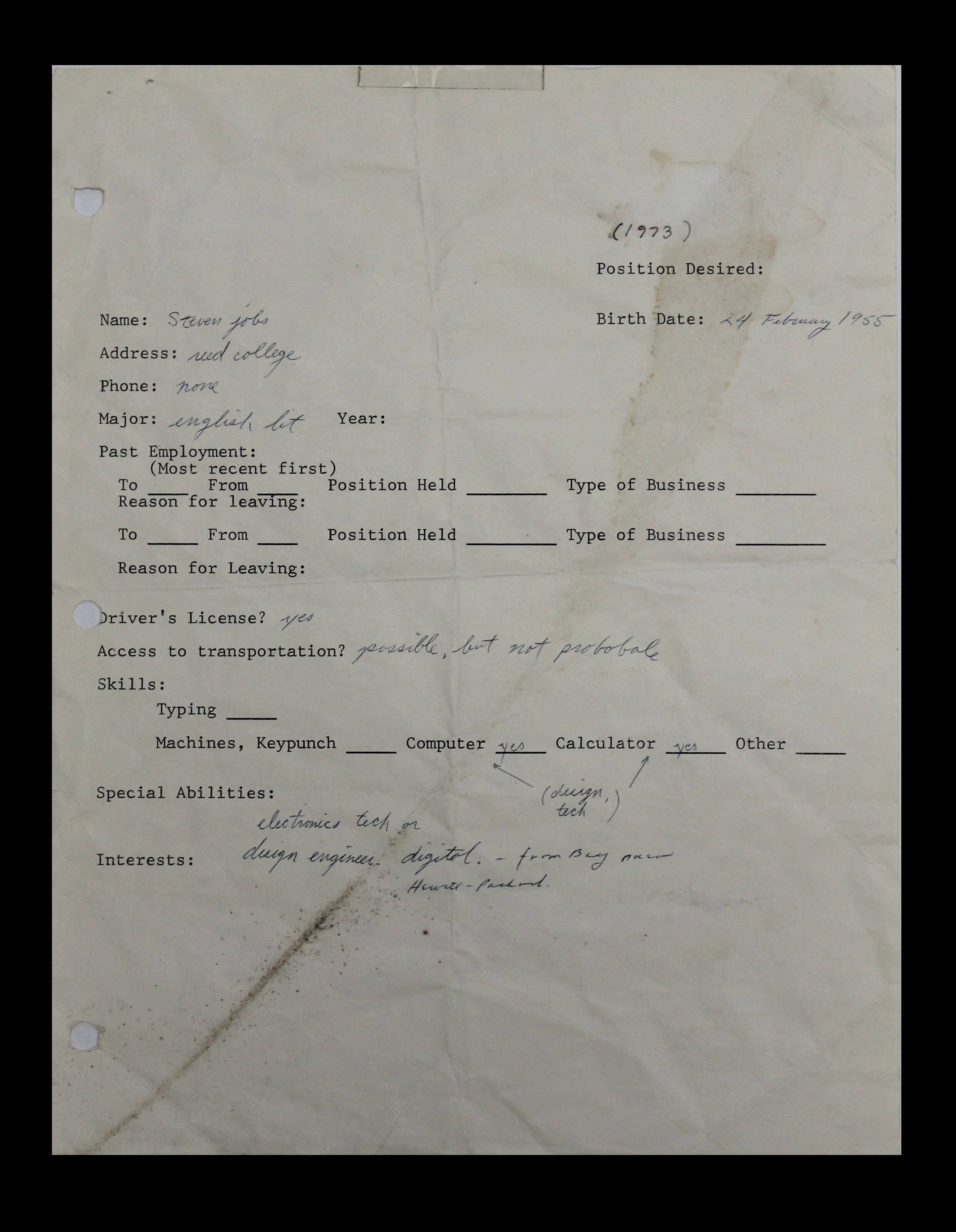 Other interesting aspects of the one-page questionnaire are that Jobs notes he does not have a phone number and has a driving license but access to transportation is “possible, but not probable” (sic).